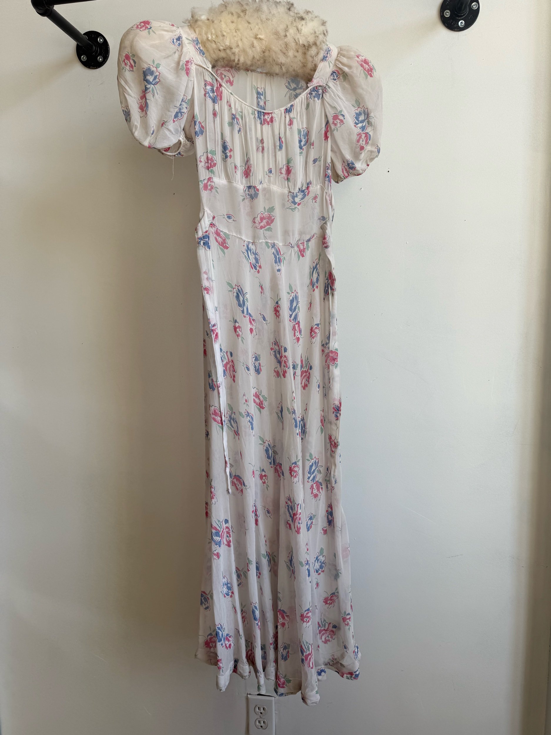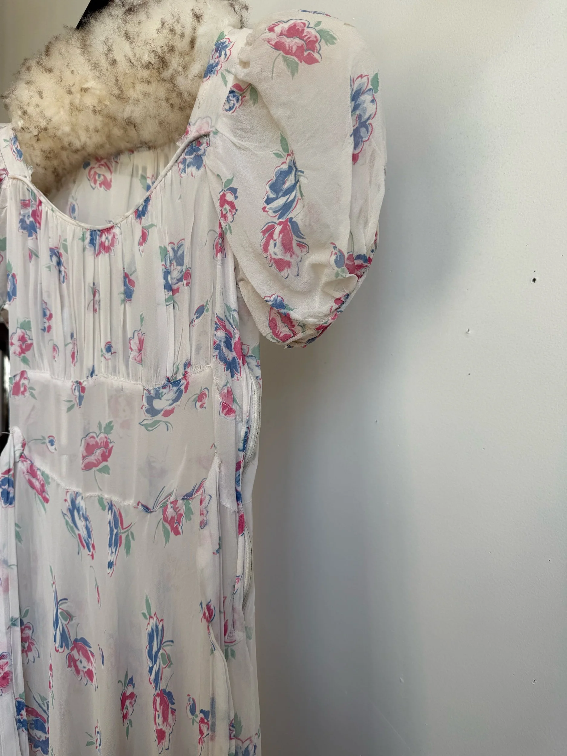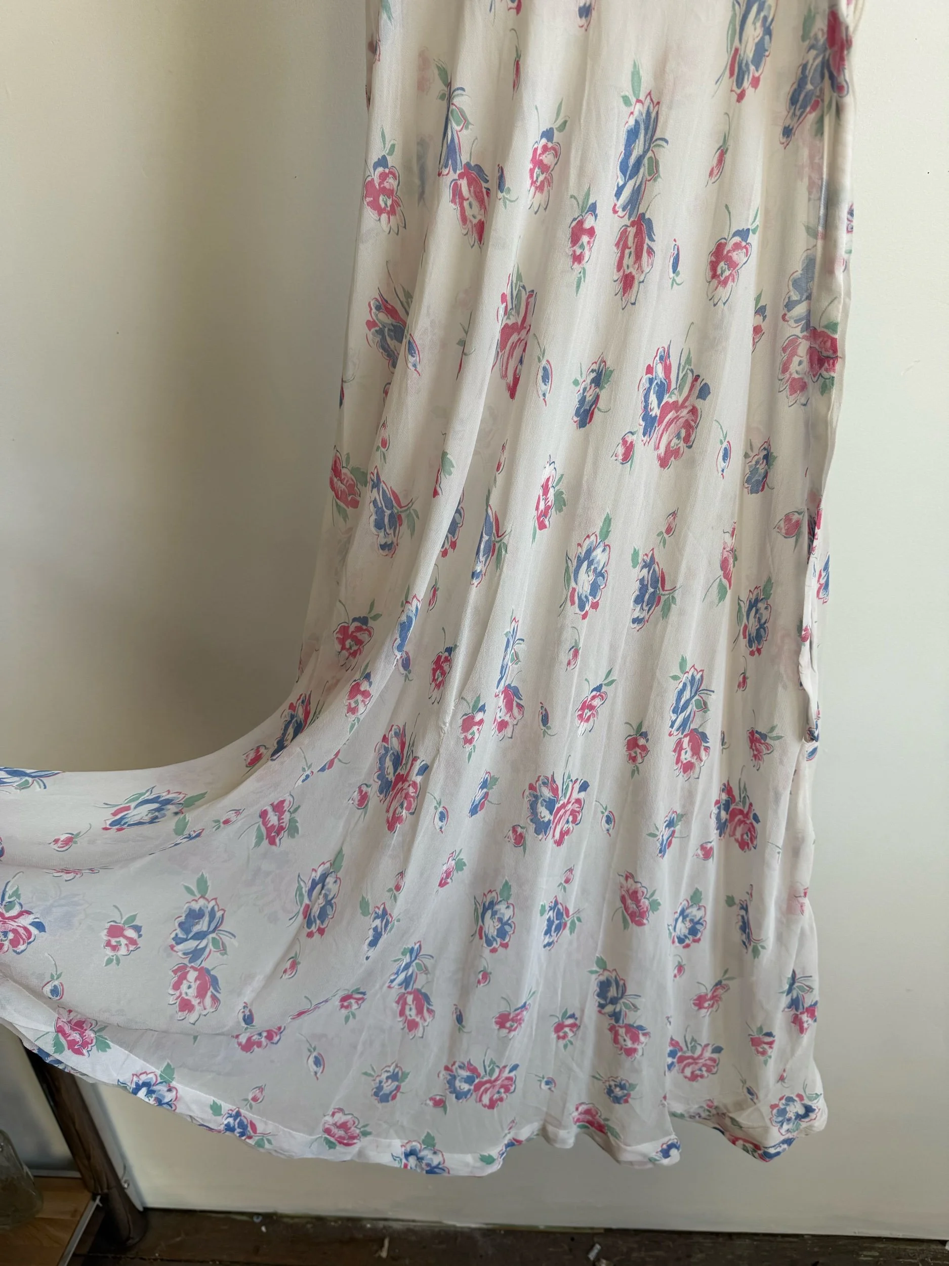 Silk chiffon floral printed semi-sheer dress. Some signs of age around the underarms but otherwise in very good condition. Best fits xs-s