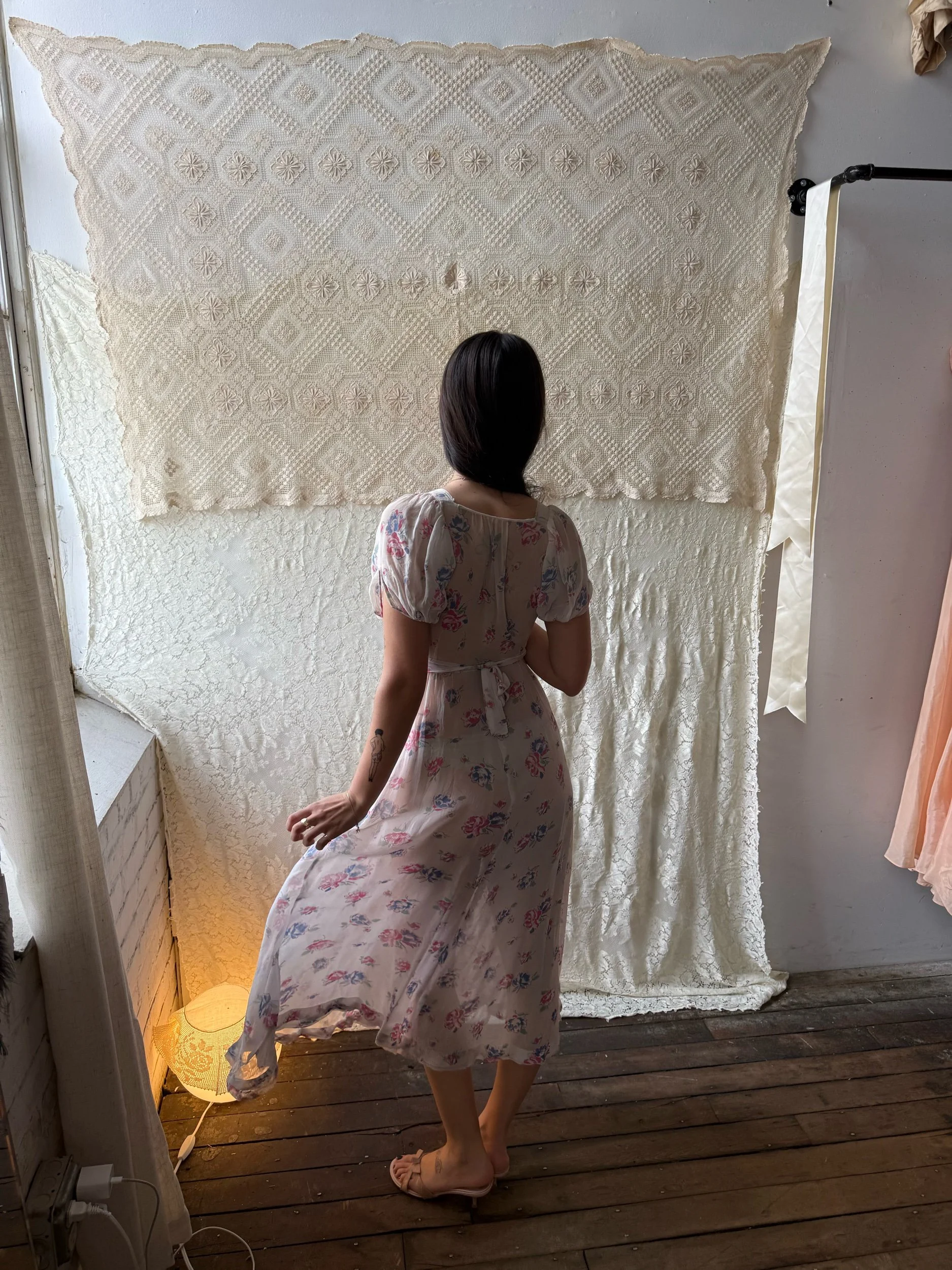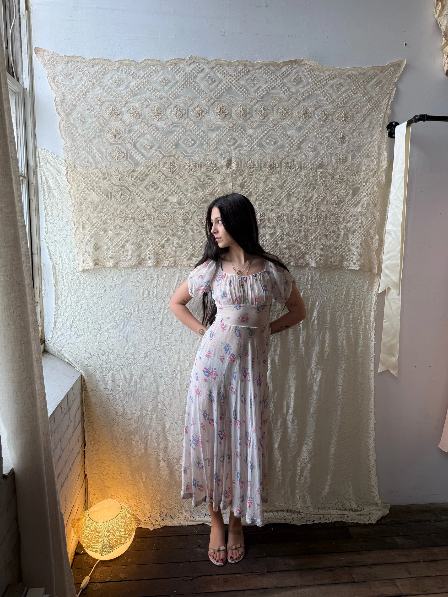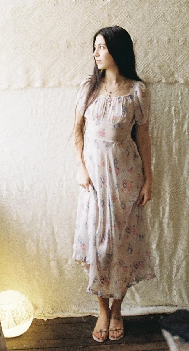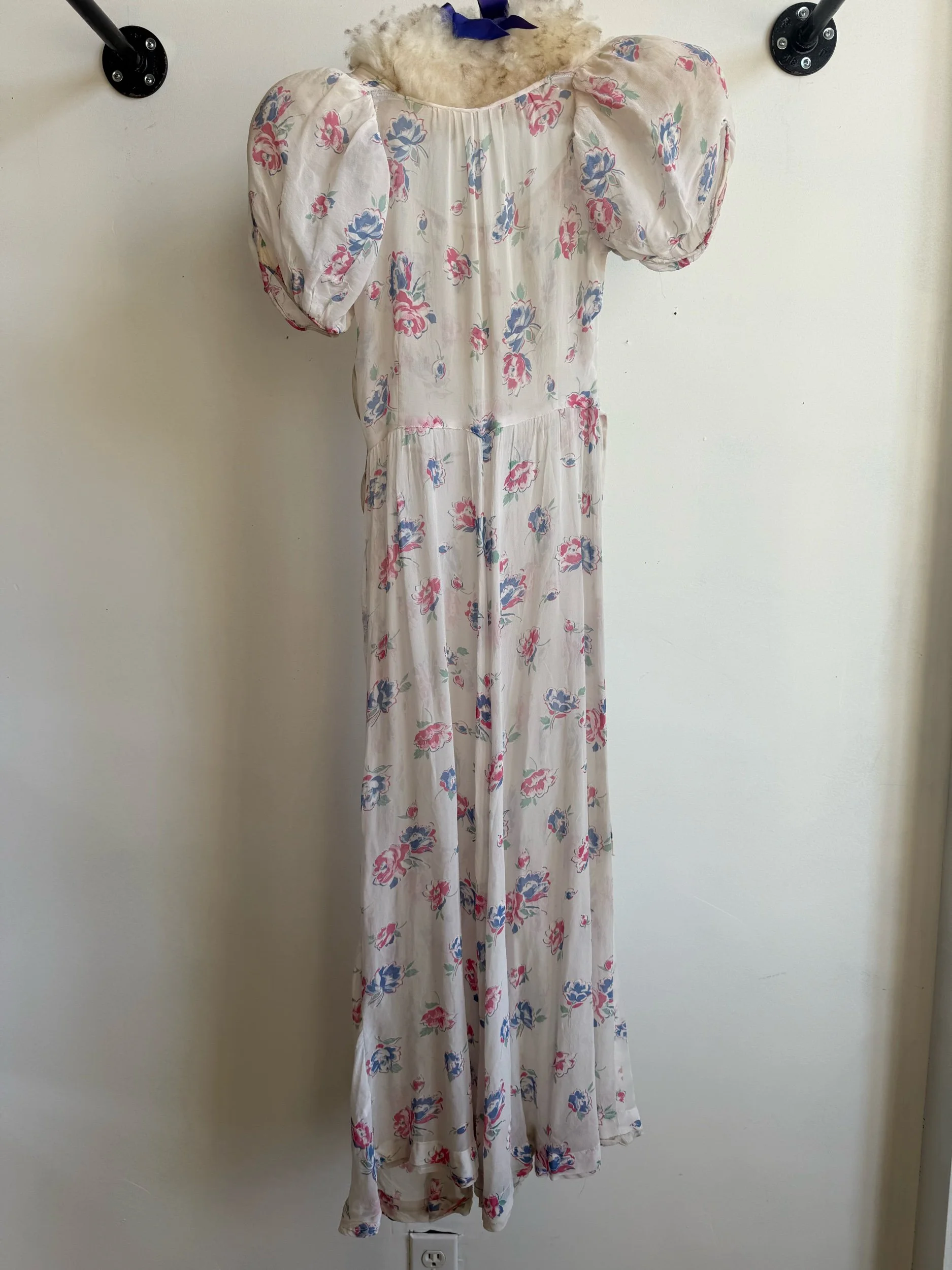 Silk chiffon floral printed semi-sheer dress. Some signs of age around the underarms but otherwise in very good condition. Best fits xs-s