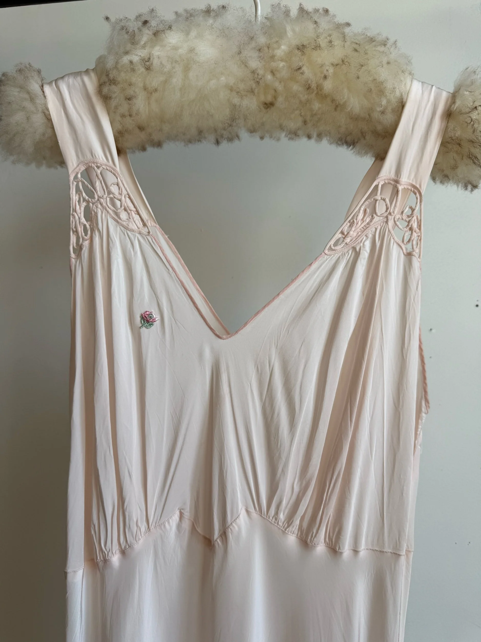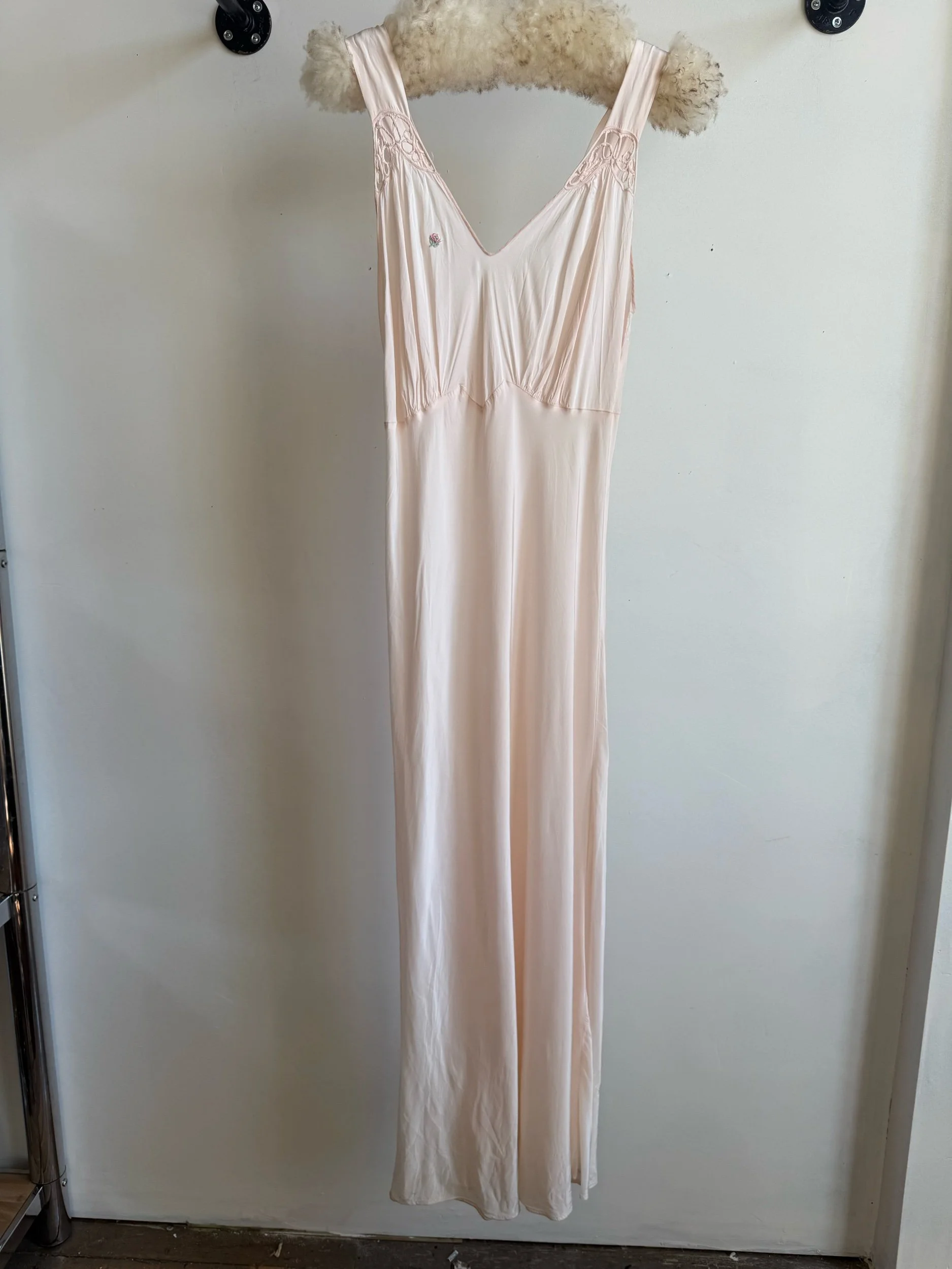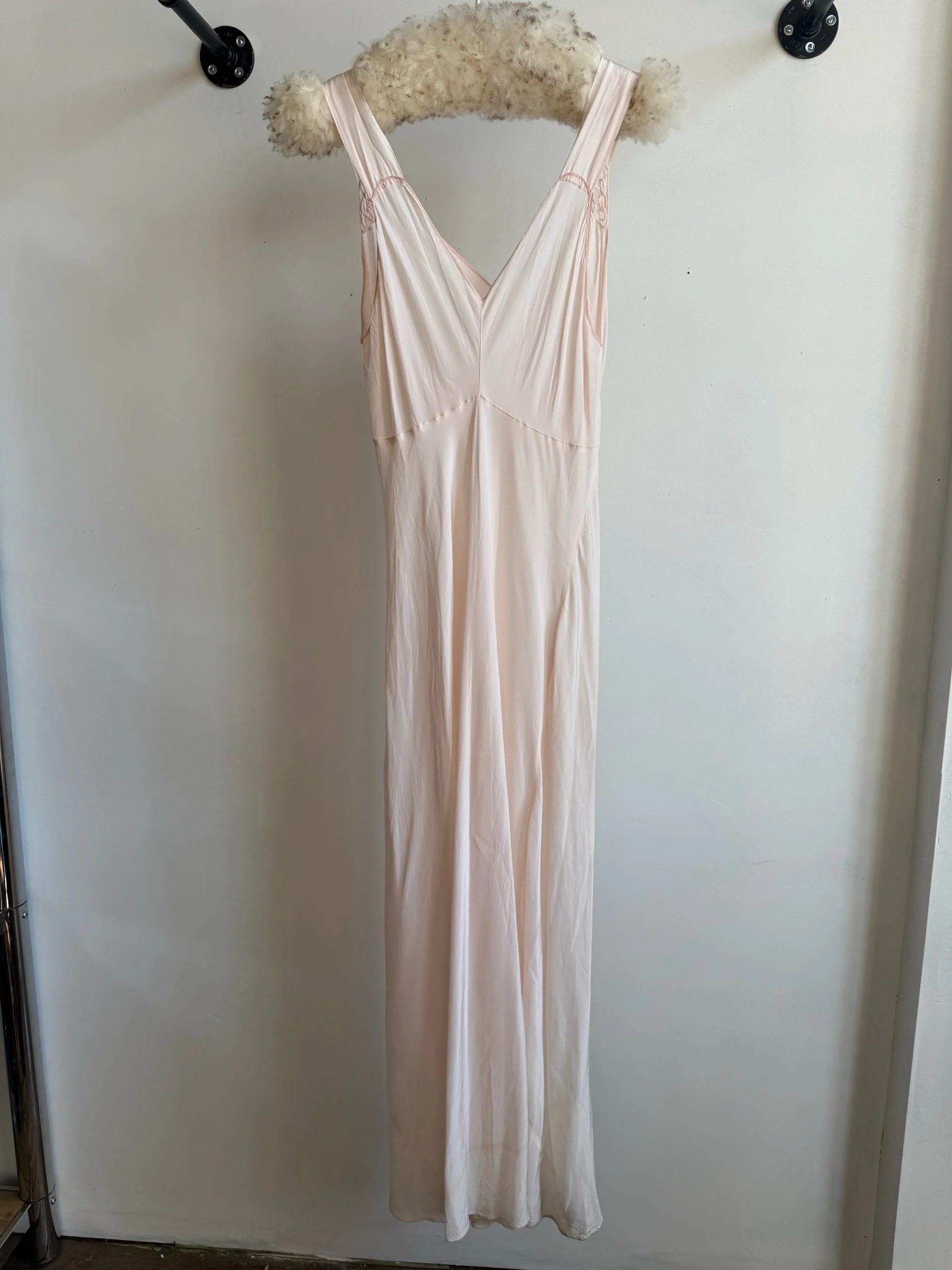 Shop › 1930's/40's Pale Pink Slip Image 1 of 7 Image 2 of 7 Image 3 of 7 Image 4 of 7 Image 5 of 7 Image 6 of 7 Image 7 of 7 1930's/40's Pale Pink Slip $165.00 Bias-cut rayon full length slip dress with floral appliquè. Fits medium+PIt-pit: 23”Waist 18”Length: 60”Model is 5’7” Add To Cart Added! Bias-cut rayon full length slip dress with floral appliquè. Fits medium+PIt-pit: 23”Waist 18”Length: 60”Model is 5’7”