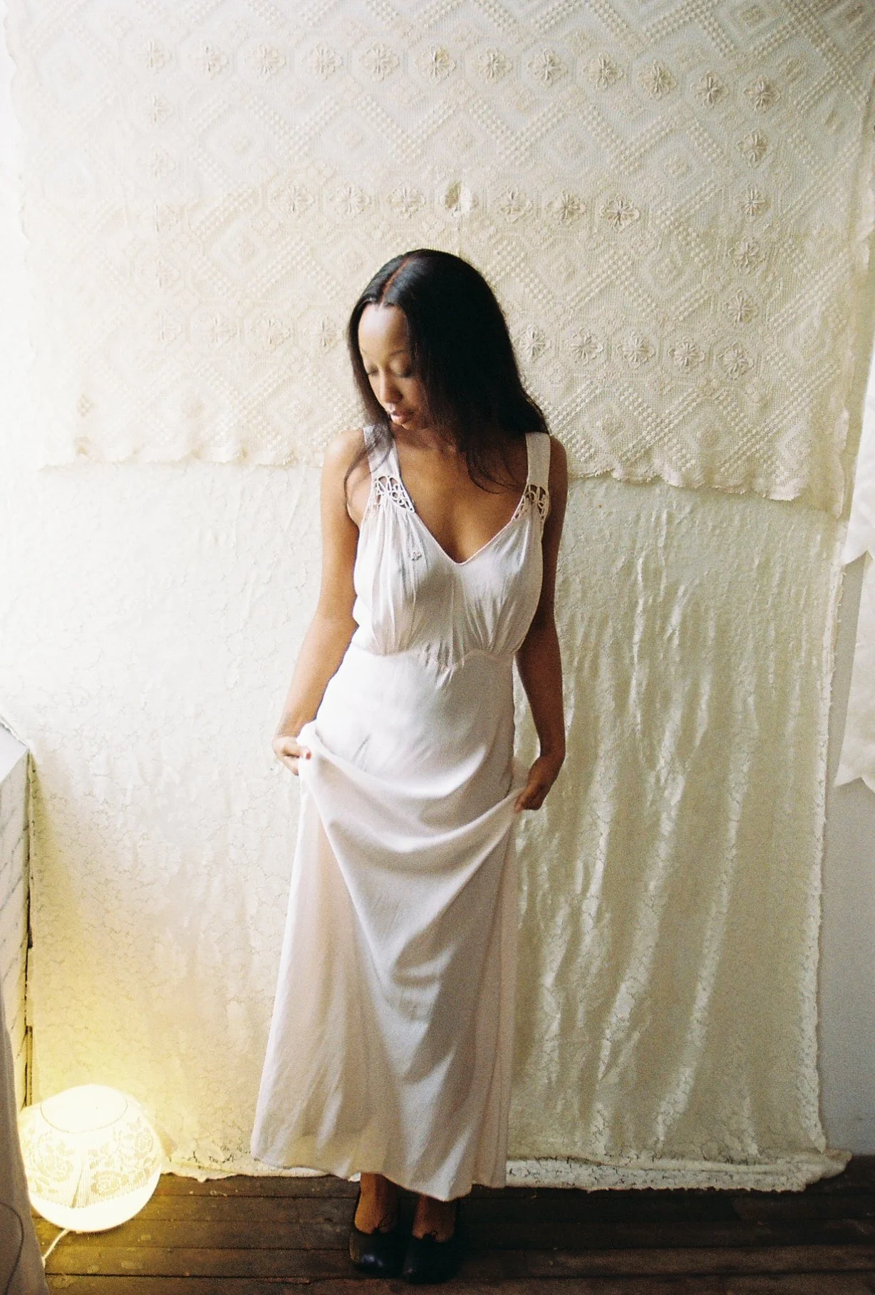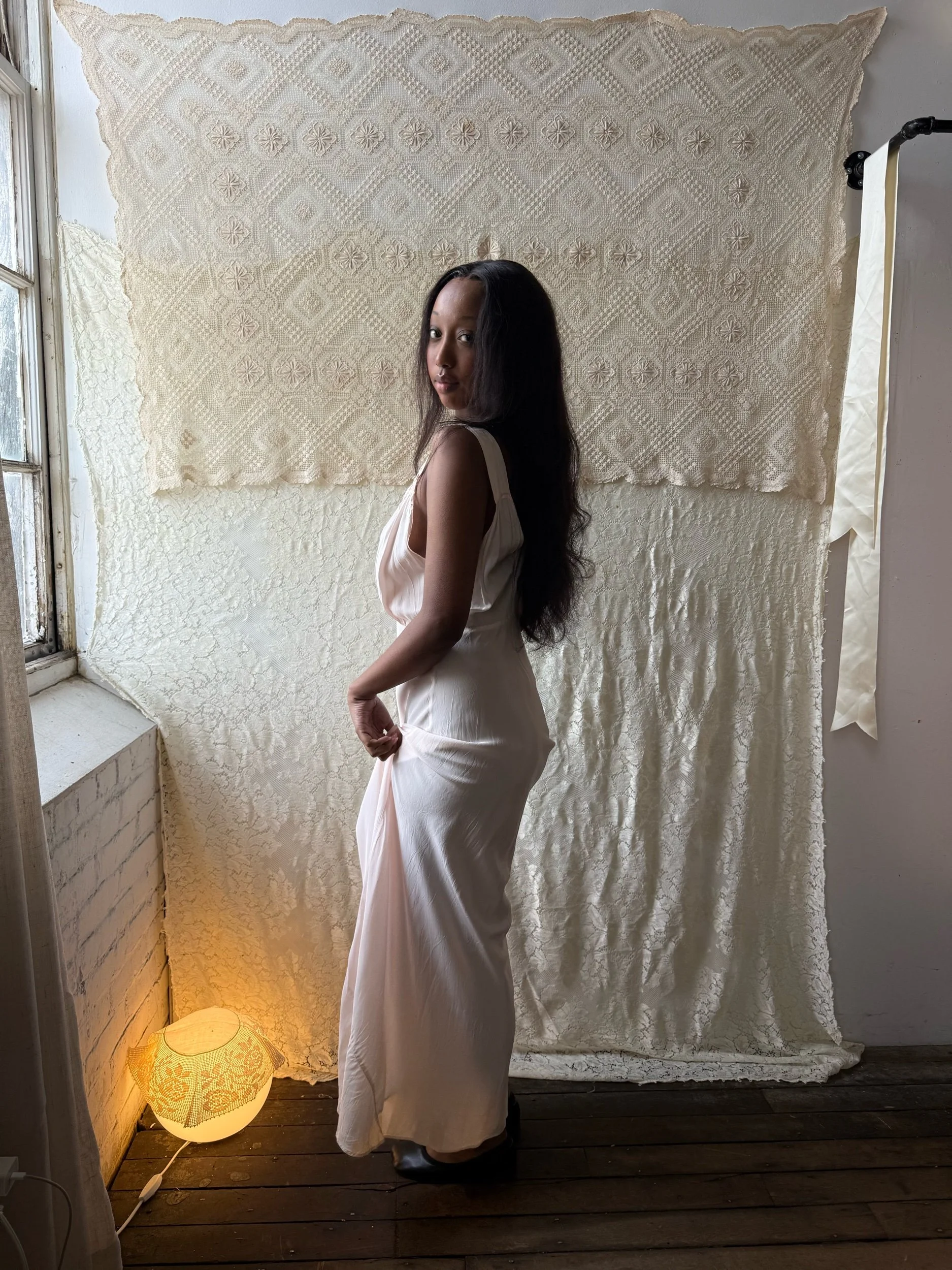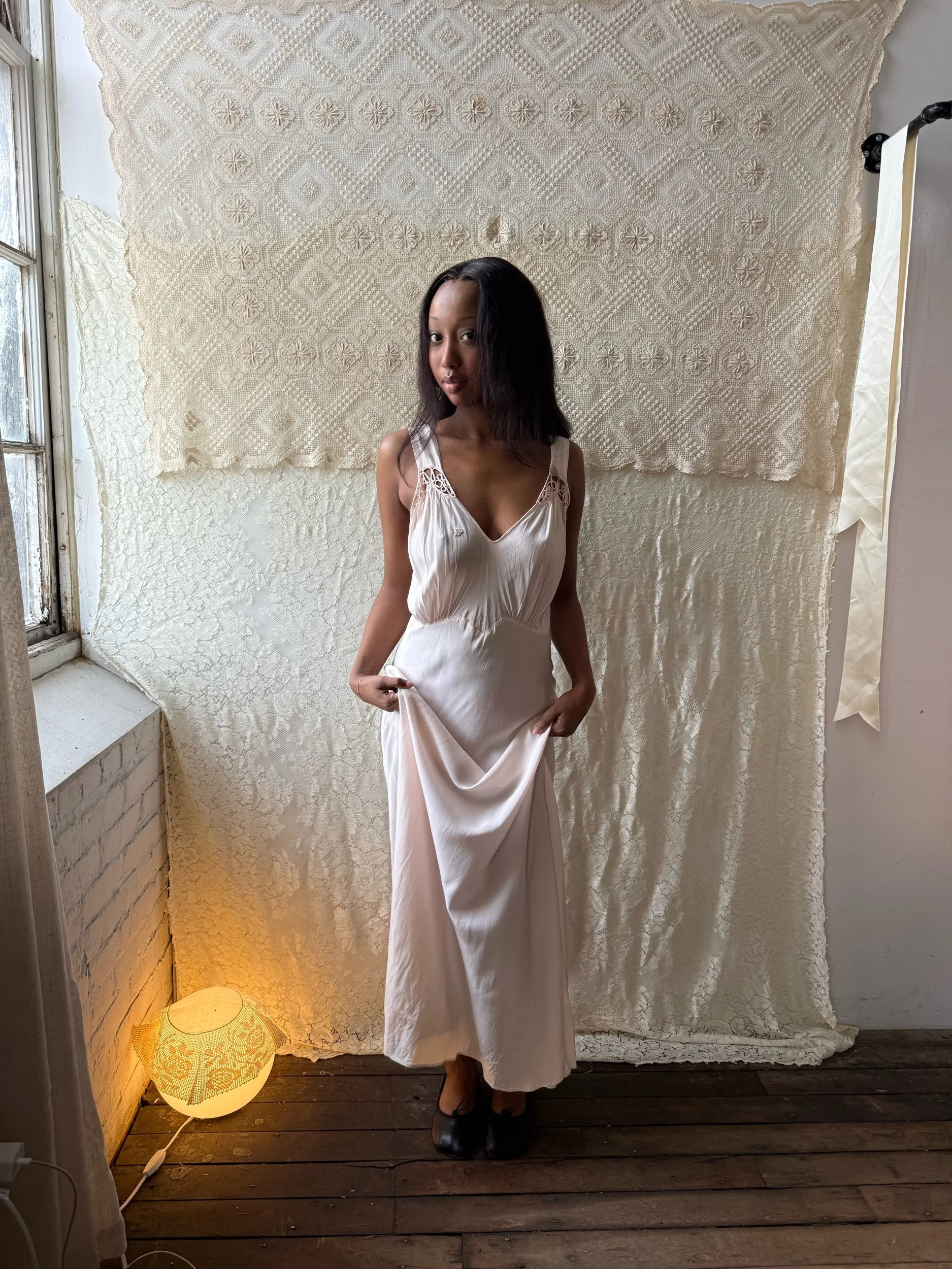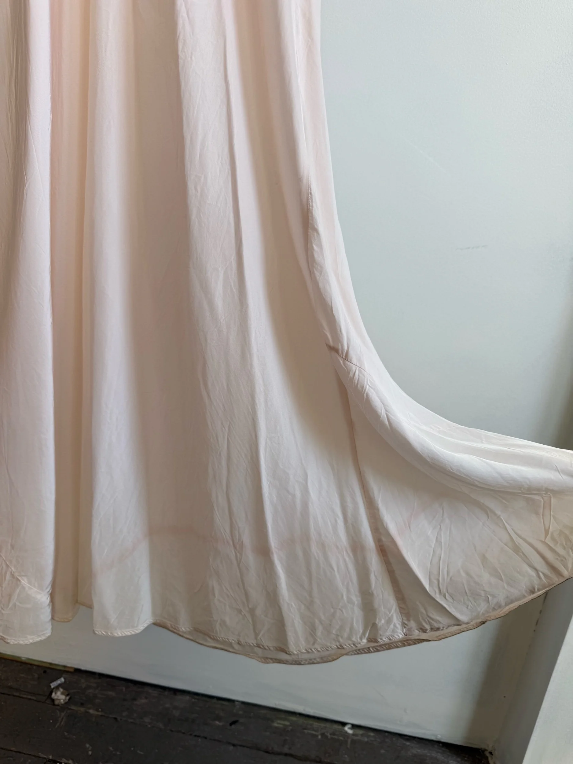 Shop › 1930's/40's Pale Pink Slip Image 1 of 7 Image 2 of 7 Image 3 of 7 Image 4 of 7 Image 5 of 7 Image 6 of 7 Image 7 of 7 1930's/40's Pale Pink Slip $165.00 Bias-cut rayon full length slip dress with floral appliquè. Fits medium+PIt-pit: 23”Waist 18”Length: 60”Model is 5’7” Add To Cart Added! Bias-cut rayon full length slip dress with floral appliquè. Fits medium+PIt-pit: 23”Waist 18”Length: 60”Model is 5’7”