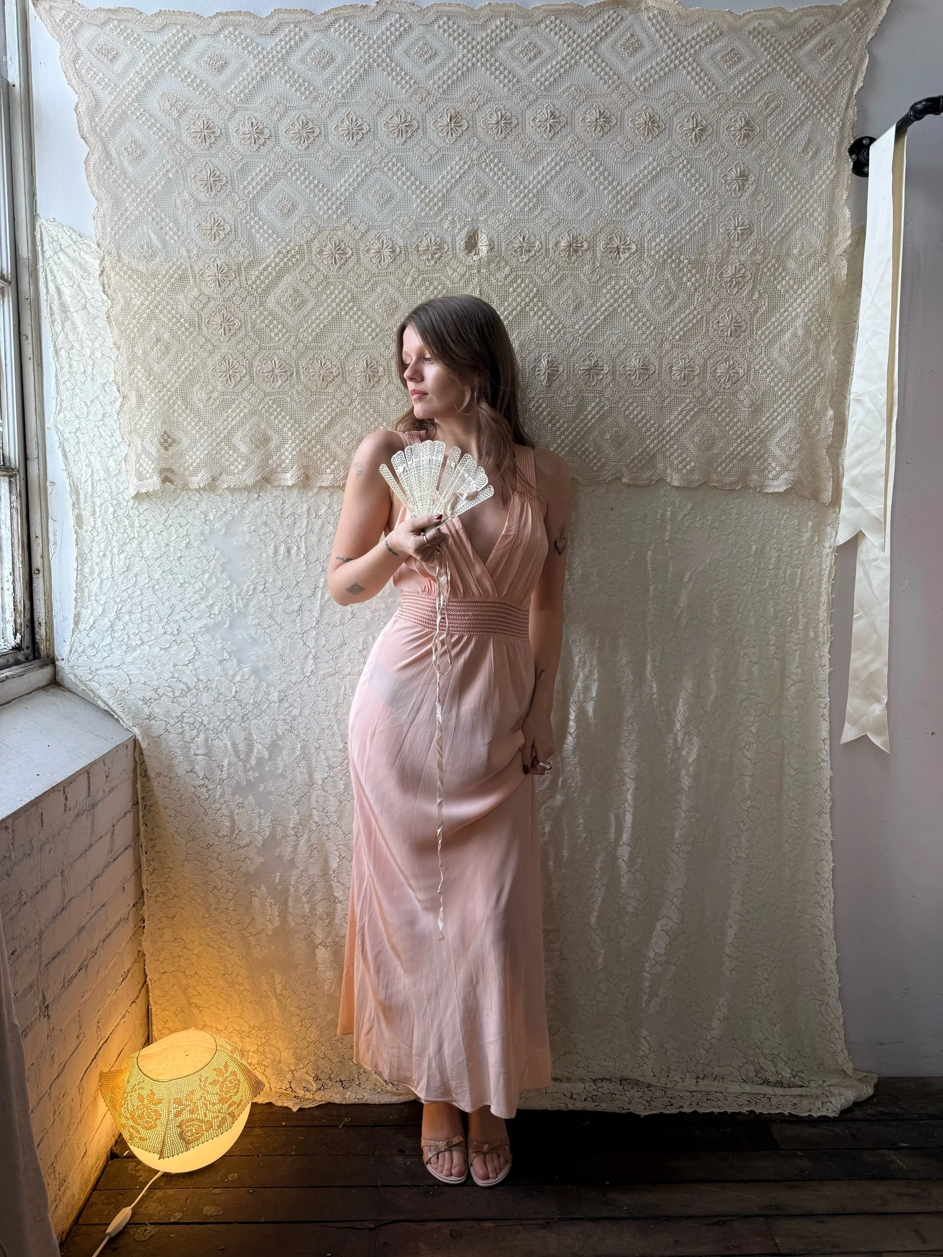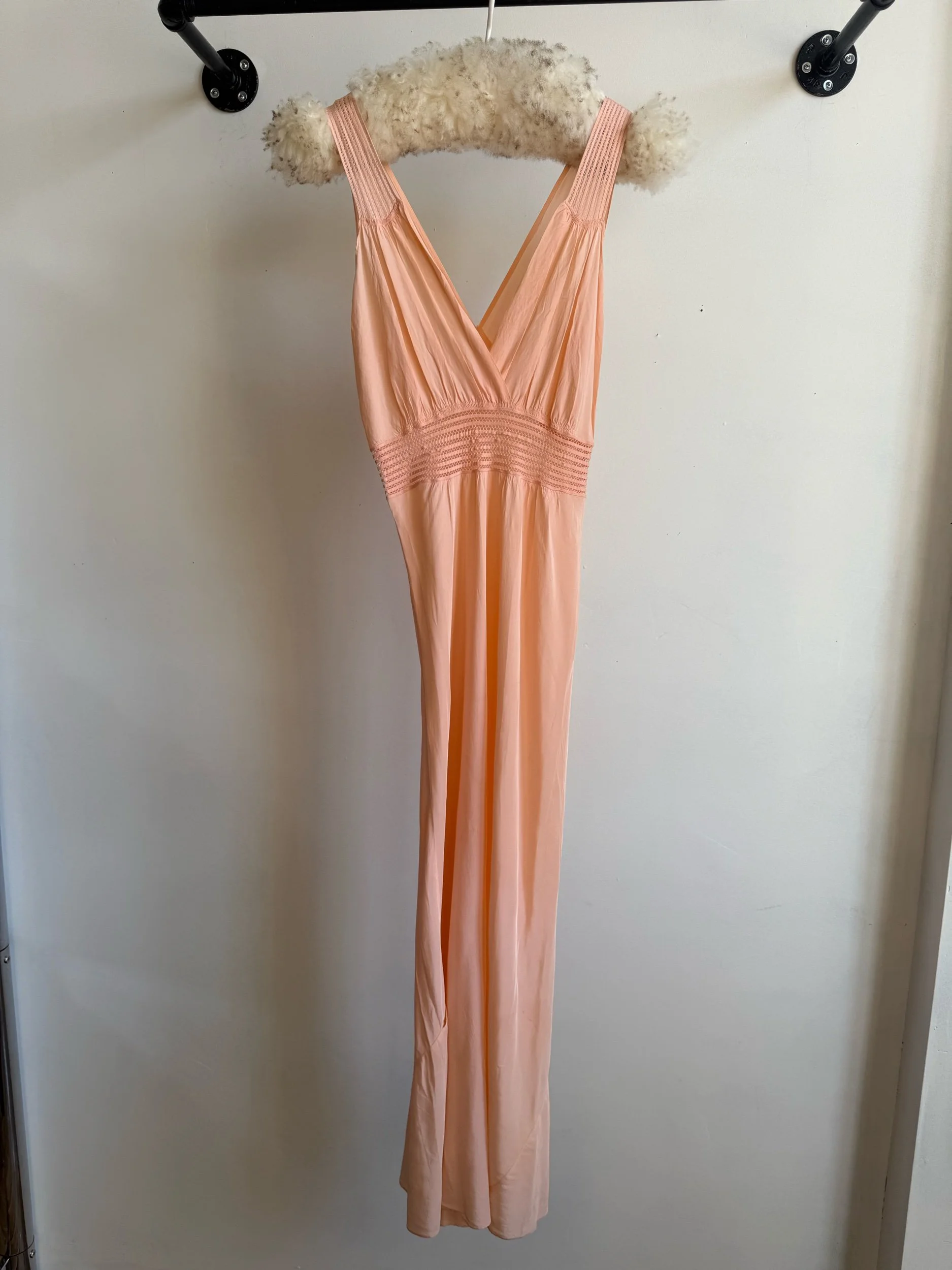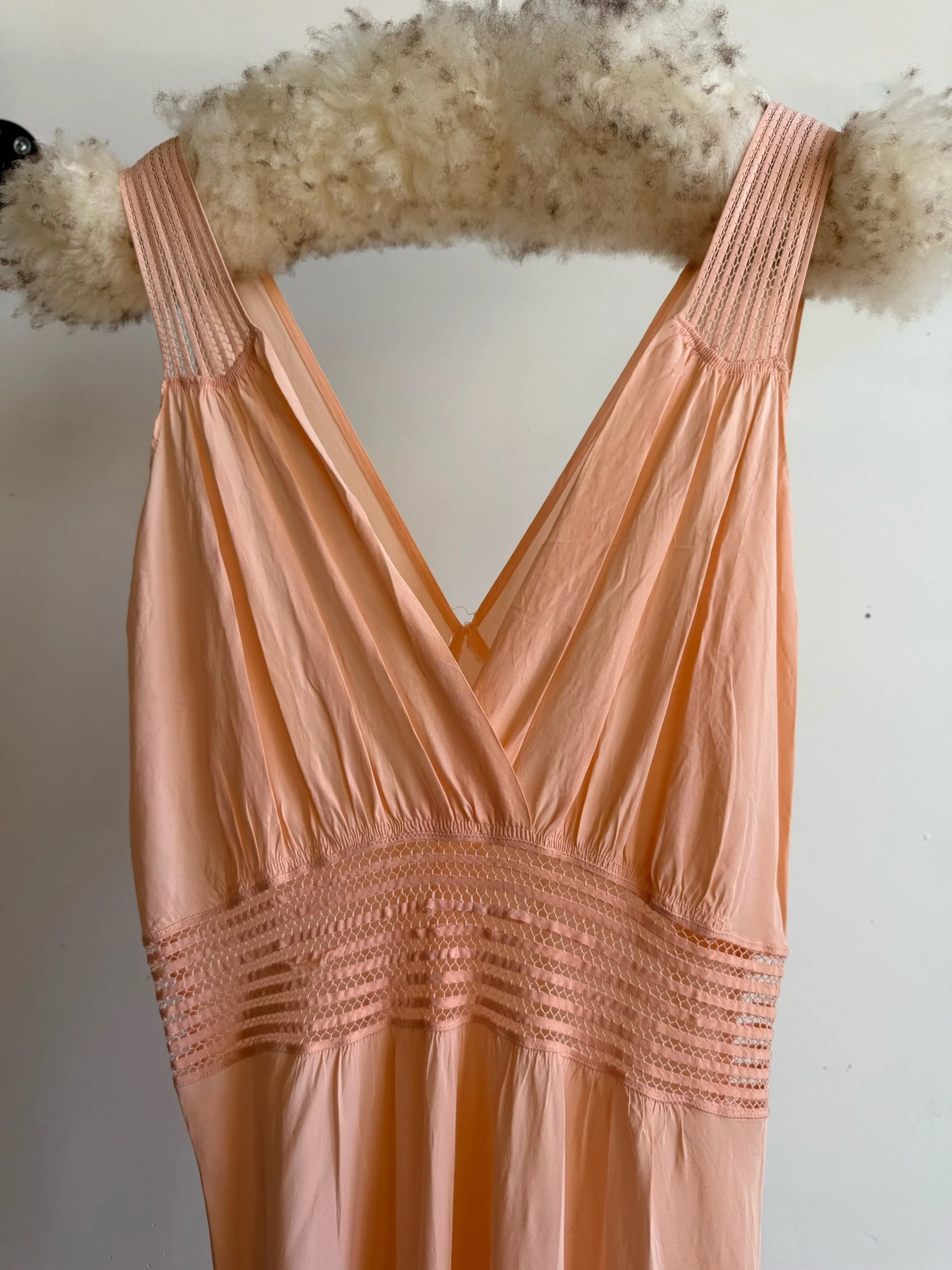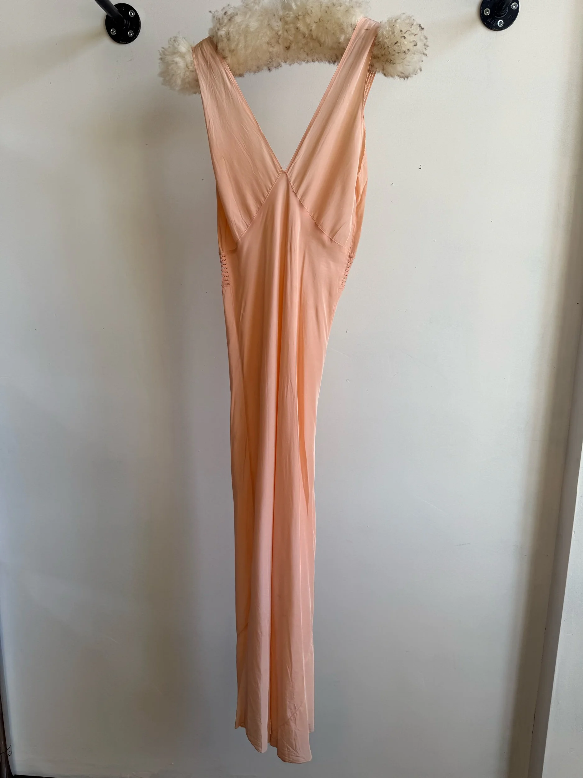 Rayon bias-cut slip with cutout details above the waist and at the shoulders. Some signs of age. Best fits small, medium, large