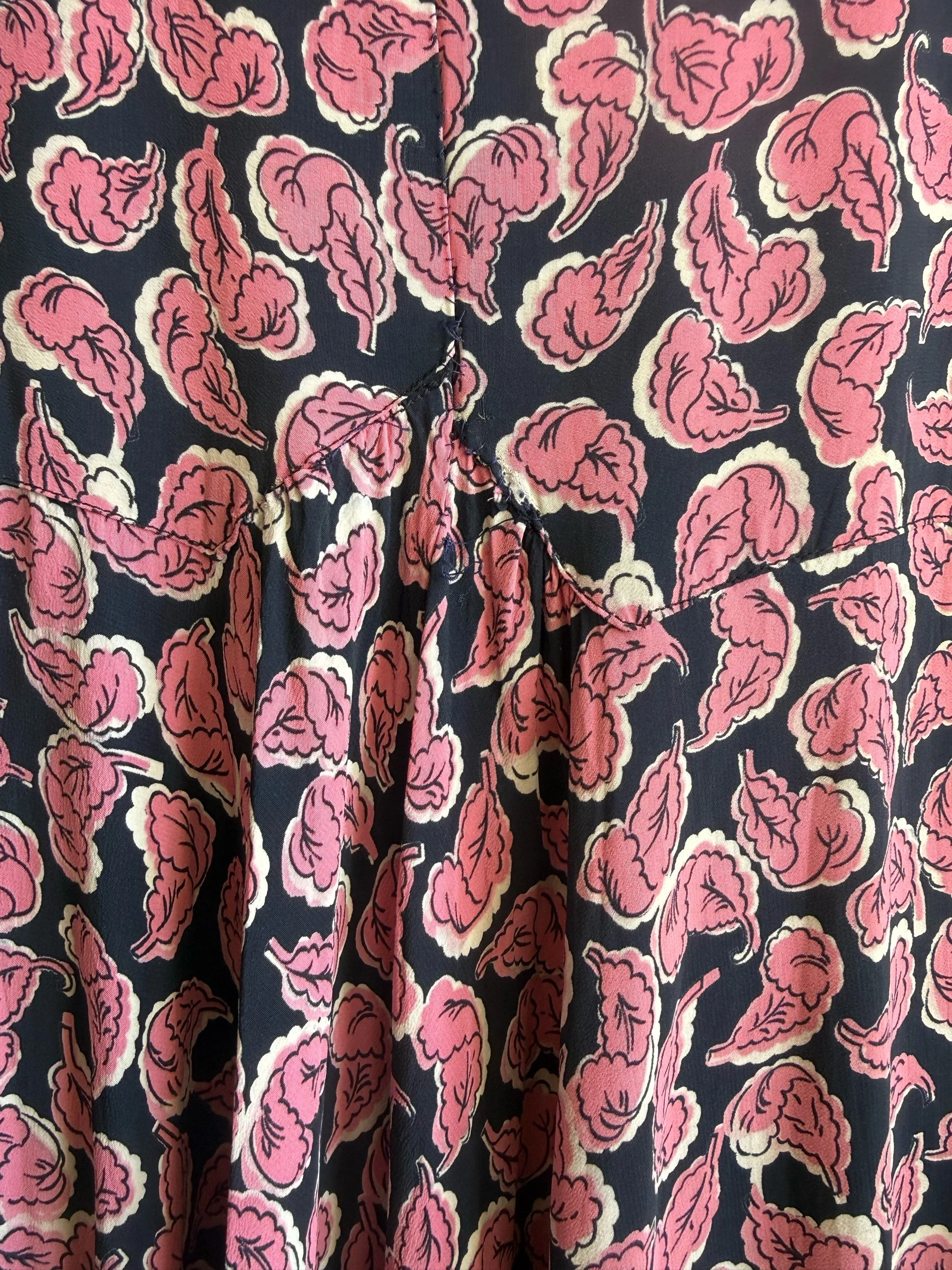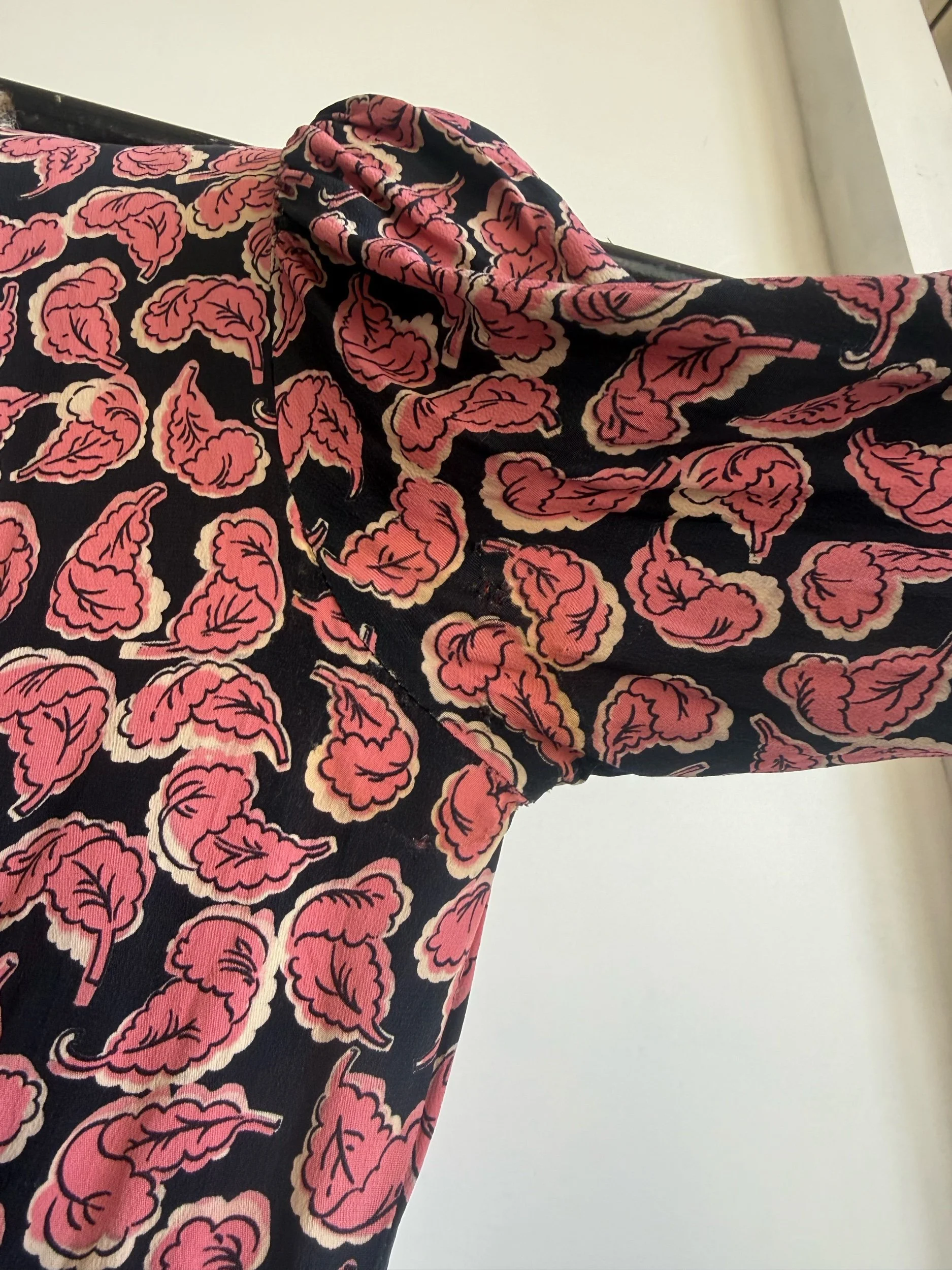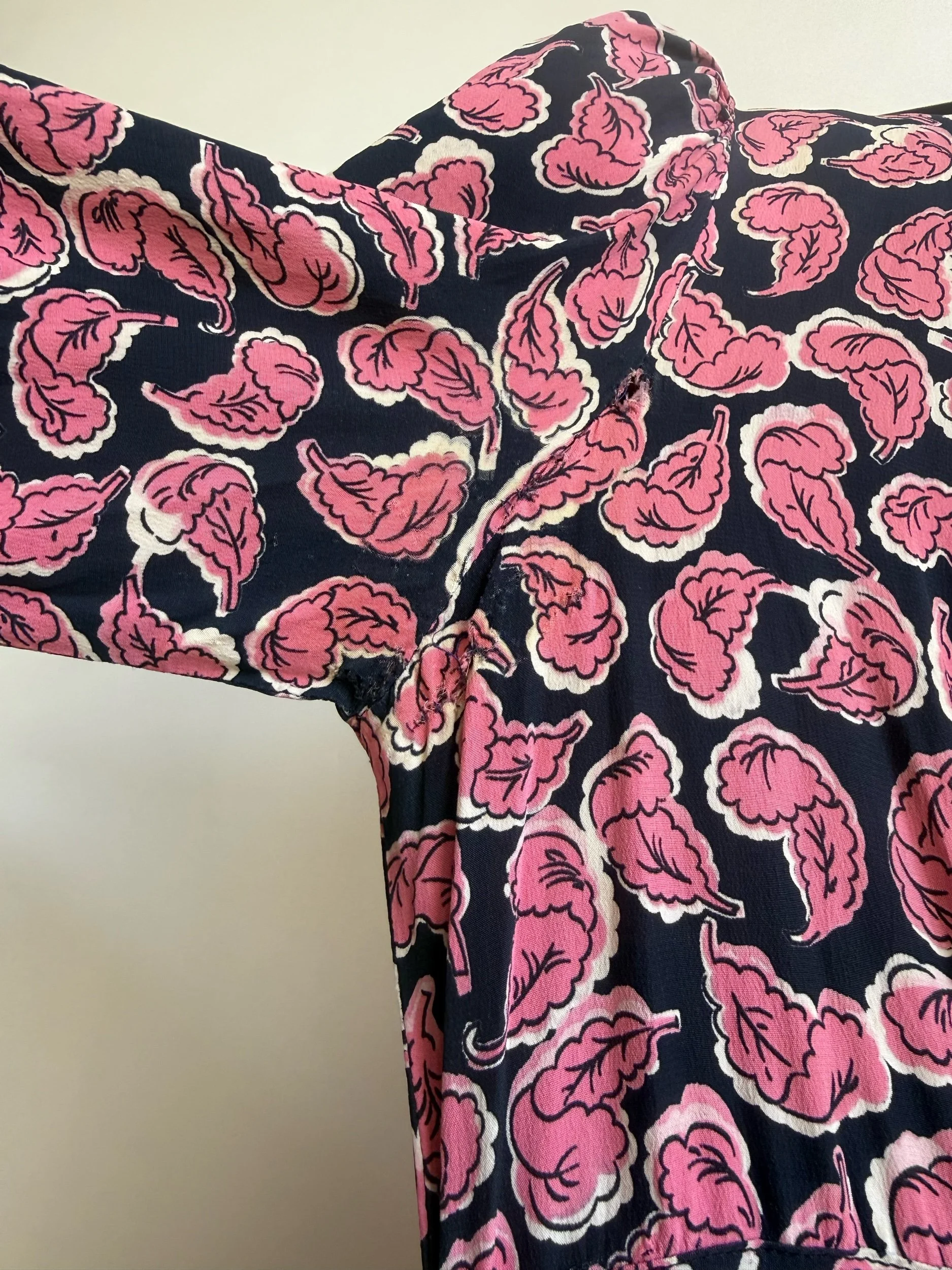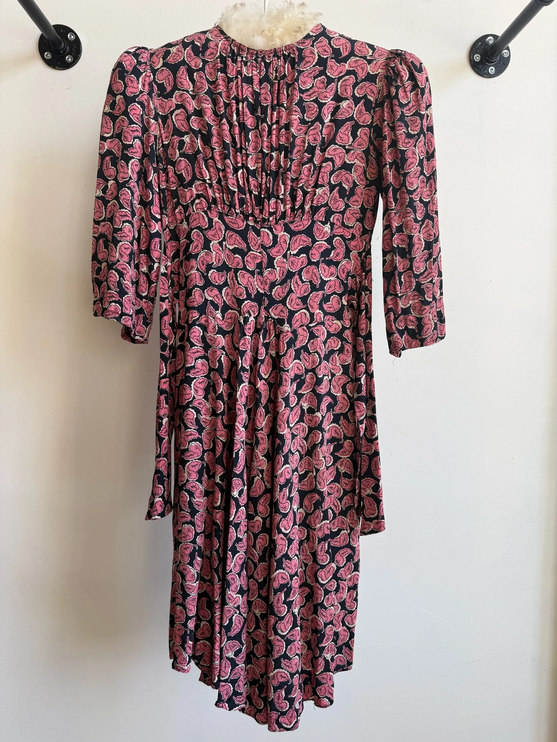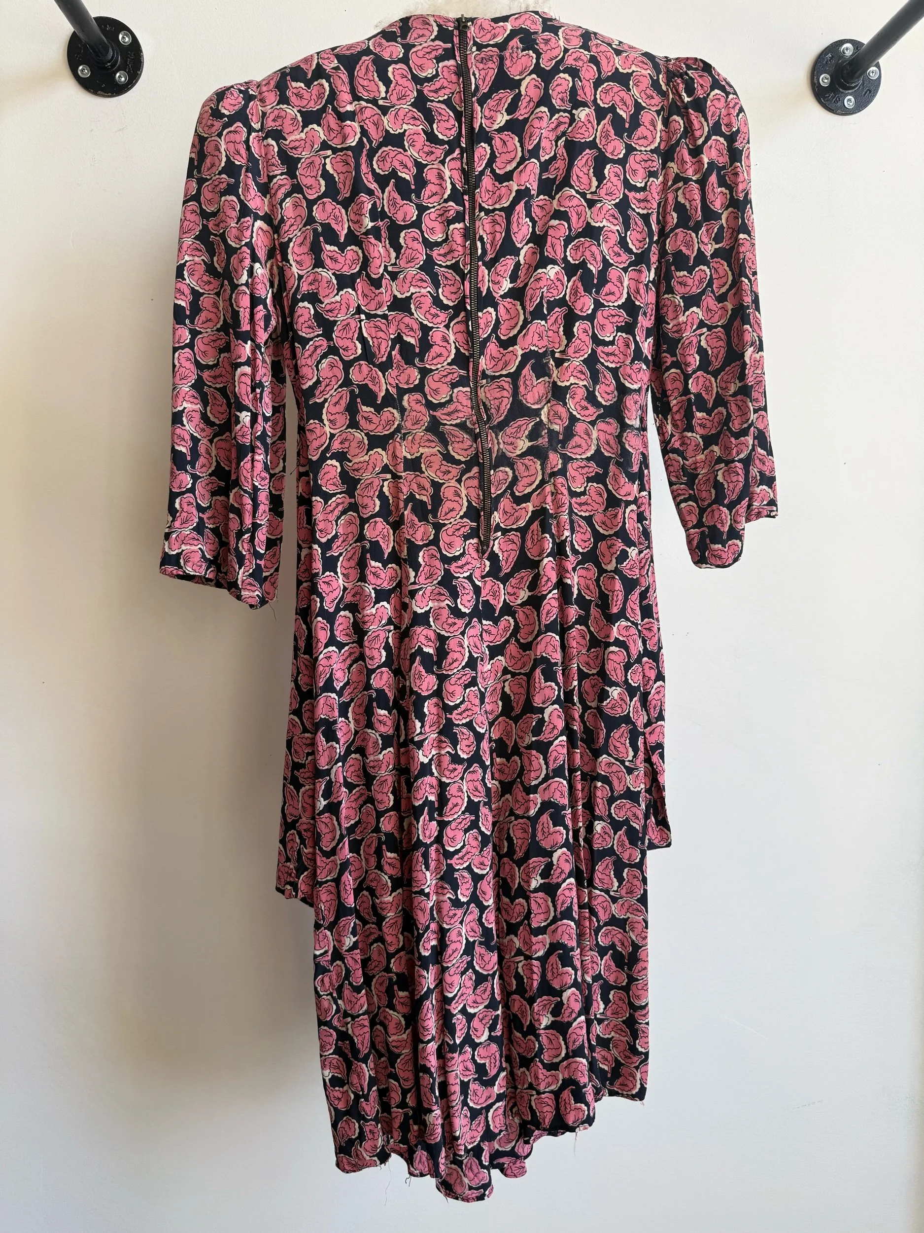 Rayon fully printed high-neck dress, 3/4 length sleeves, knee length. Some signs of age/ thinning of the fabric at the back and the underarms. Best for xs/s