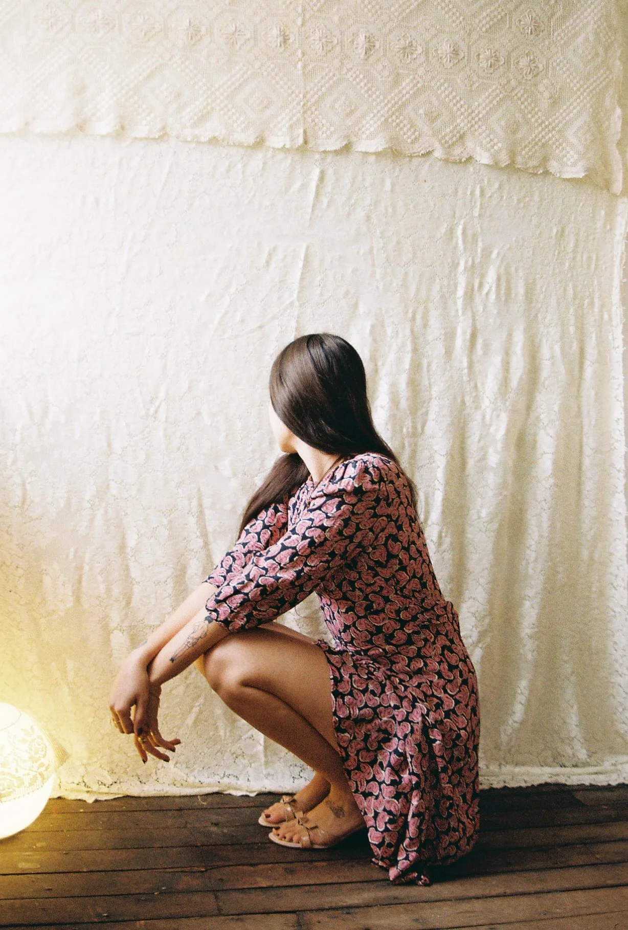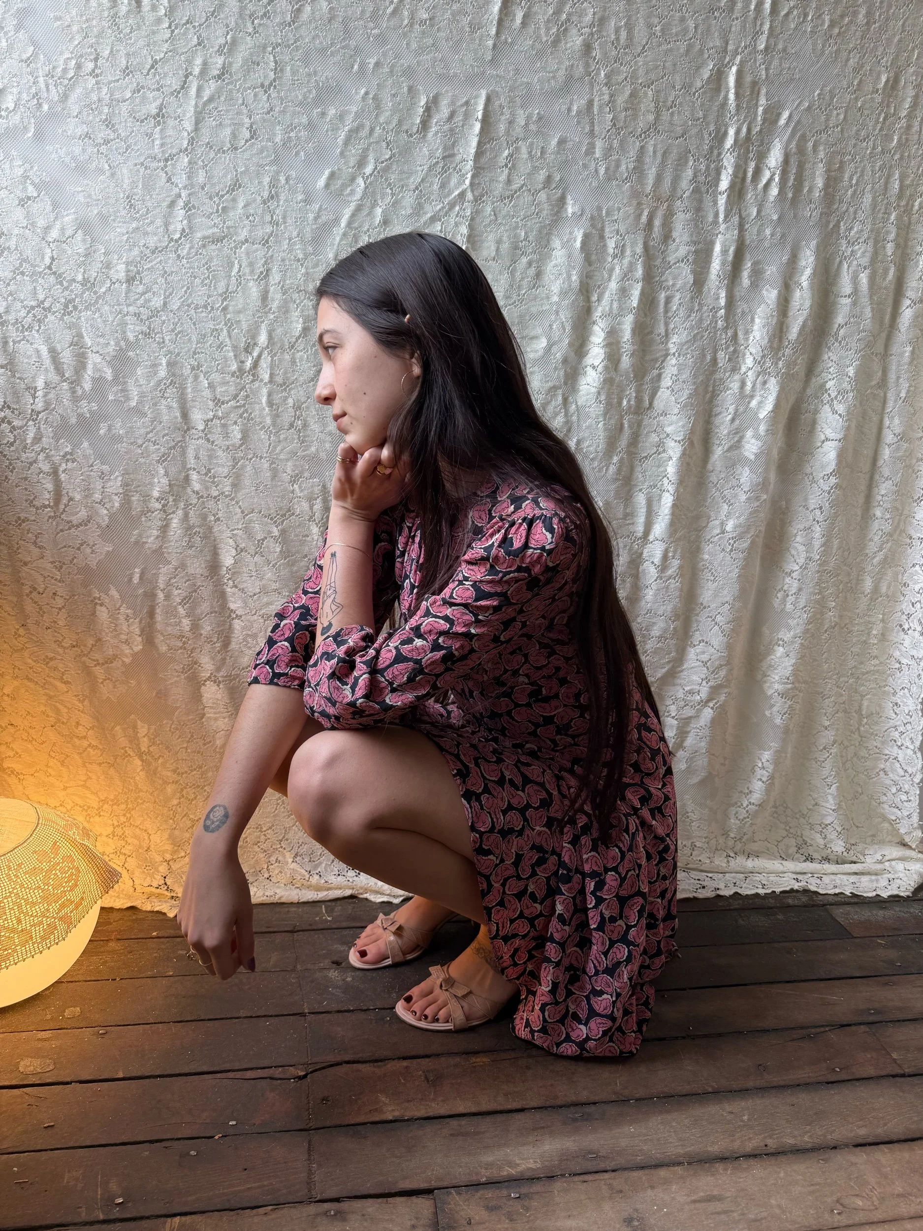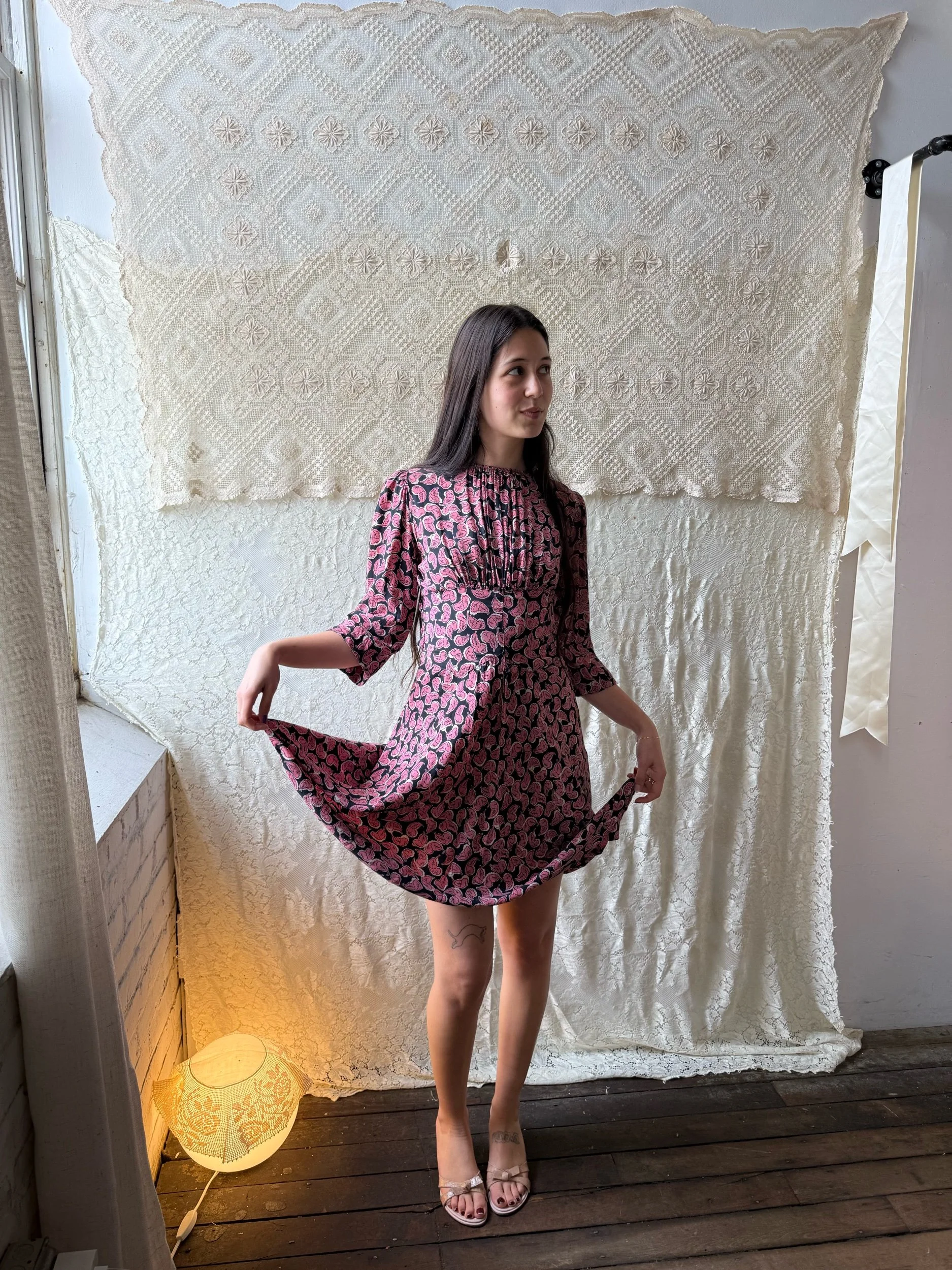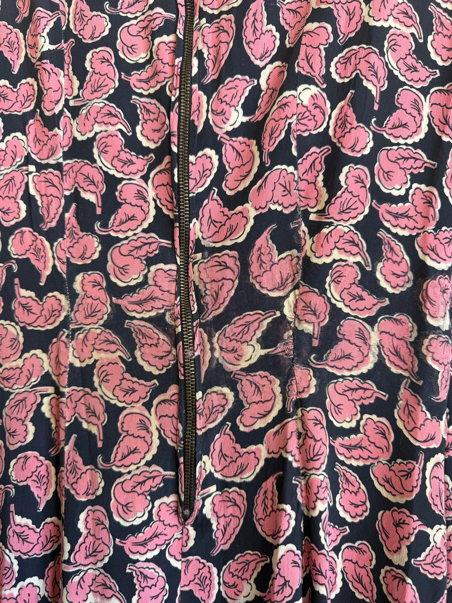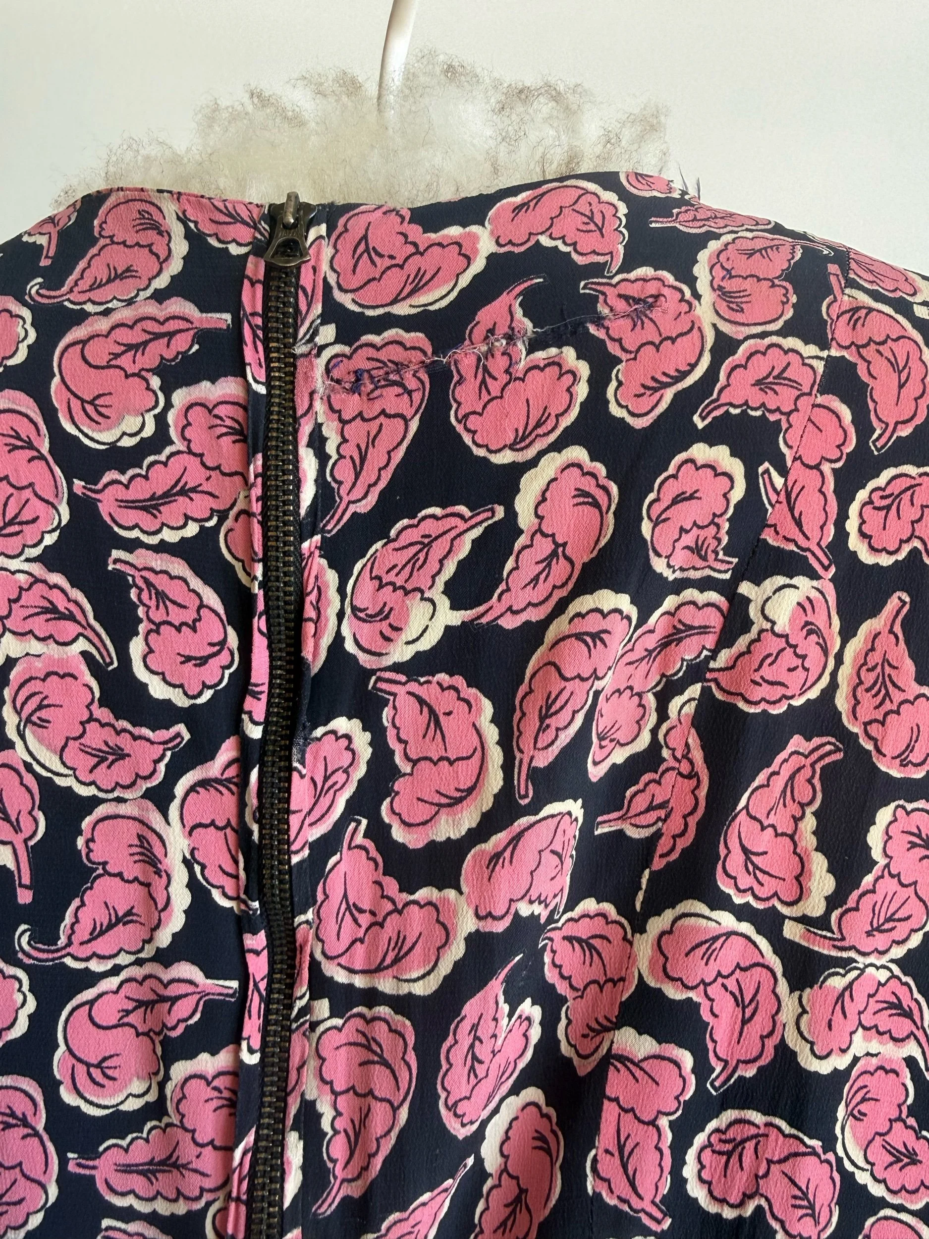 Rayon fully printed high-neck dress, 3/4 length sleeves, knee length. Some signs of age/ thinning of the fabric at the back and the underarms. Best for xs/s