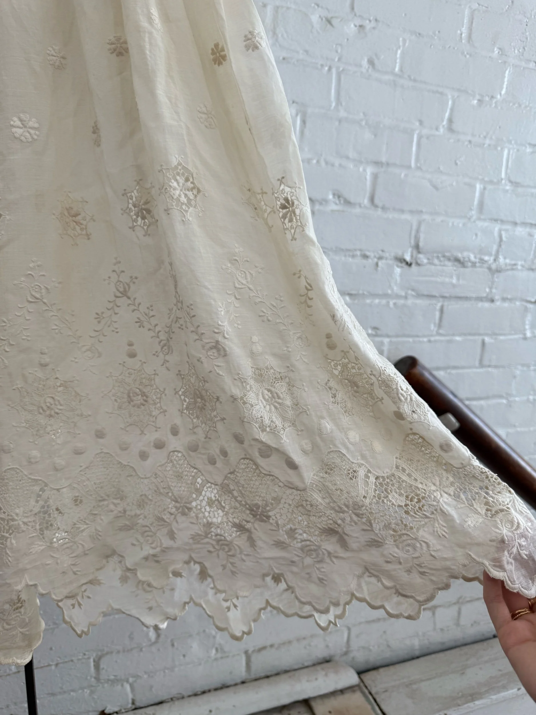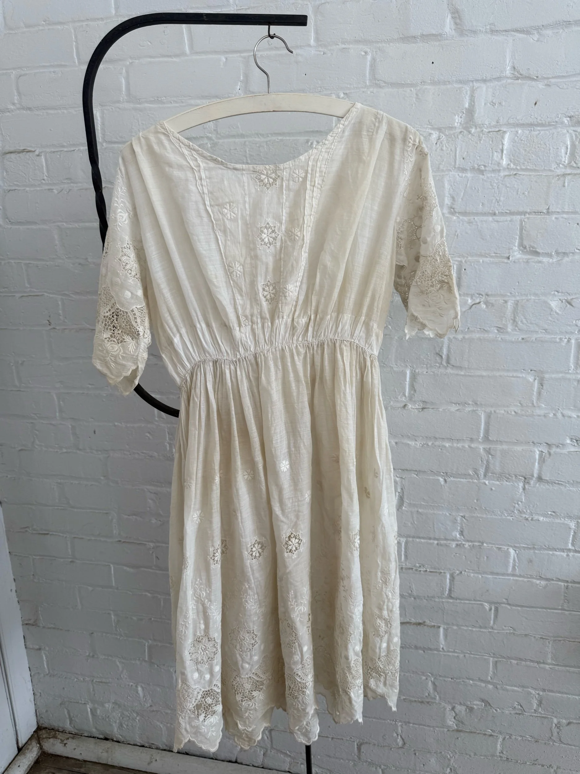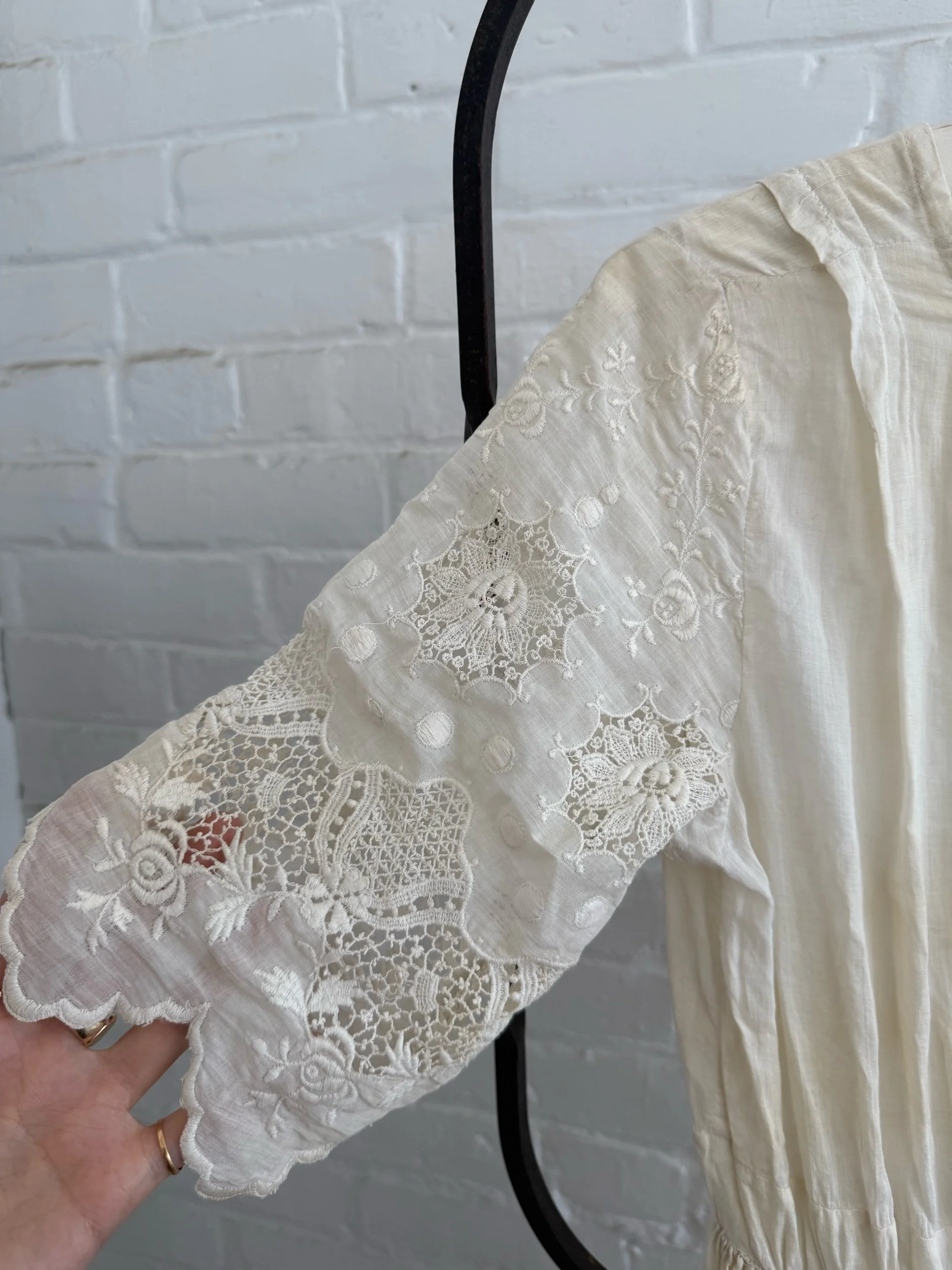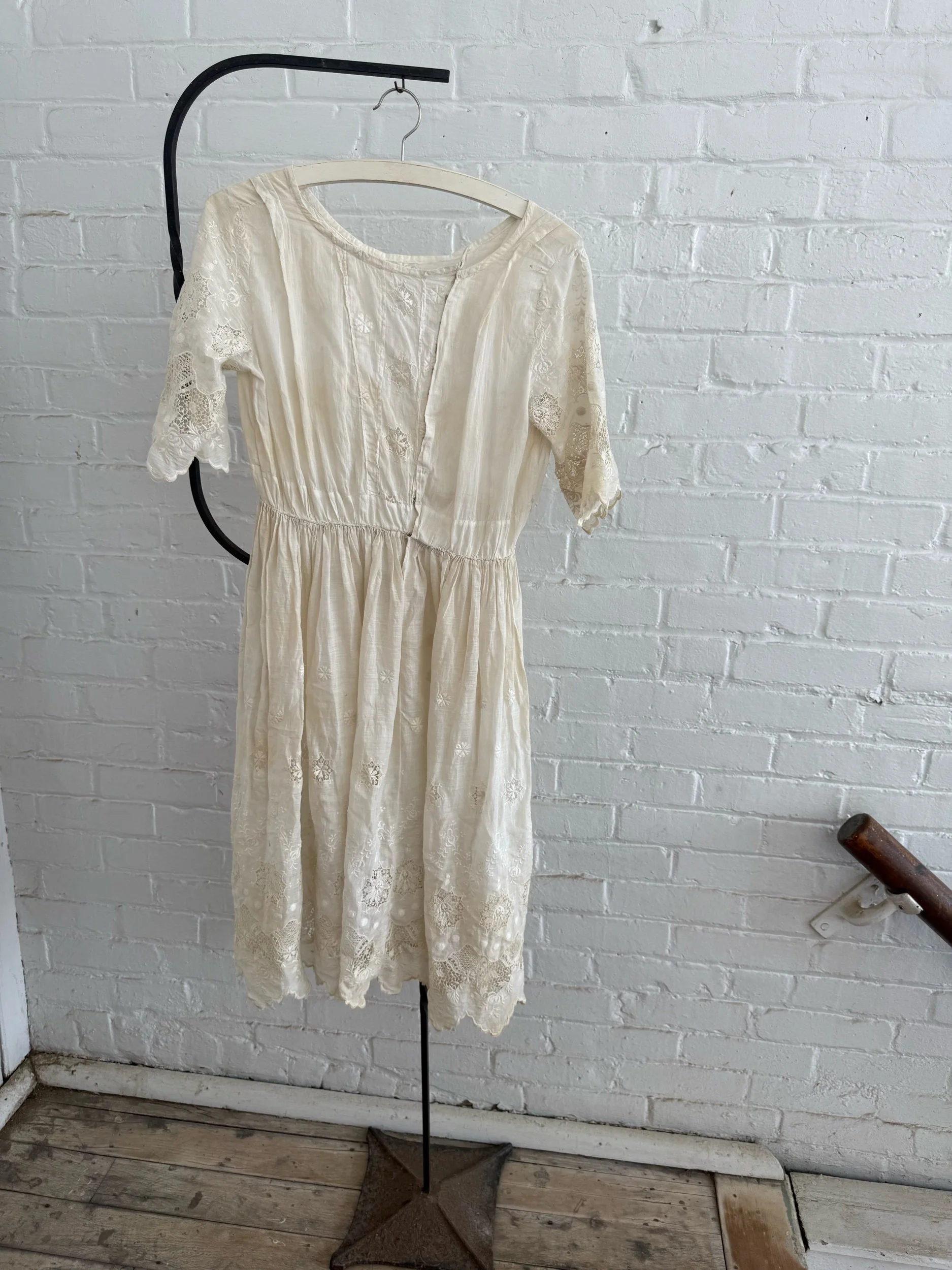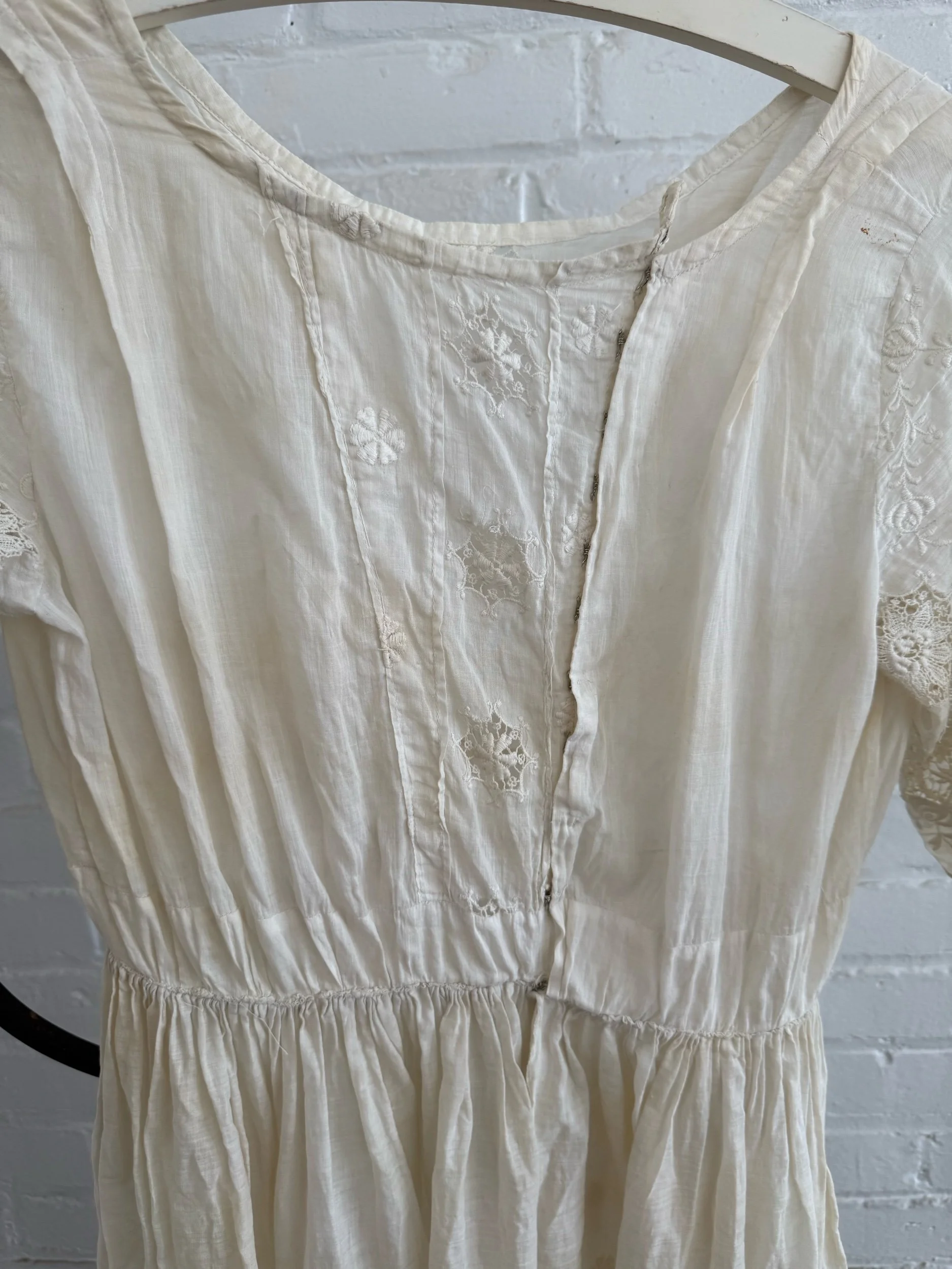 Midi length cotton Edwardian era dress, snap closure, could be worn with the snaps in the front or back! Washed by me, still has some slight discoloration in some areas.
