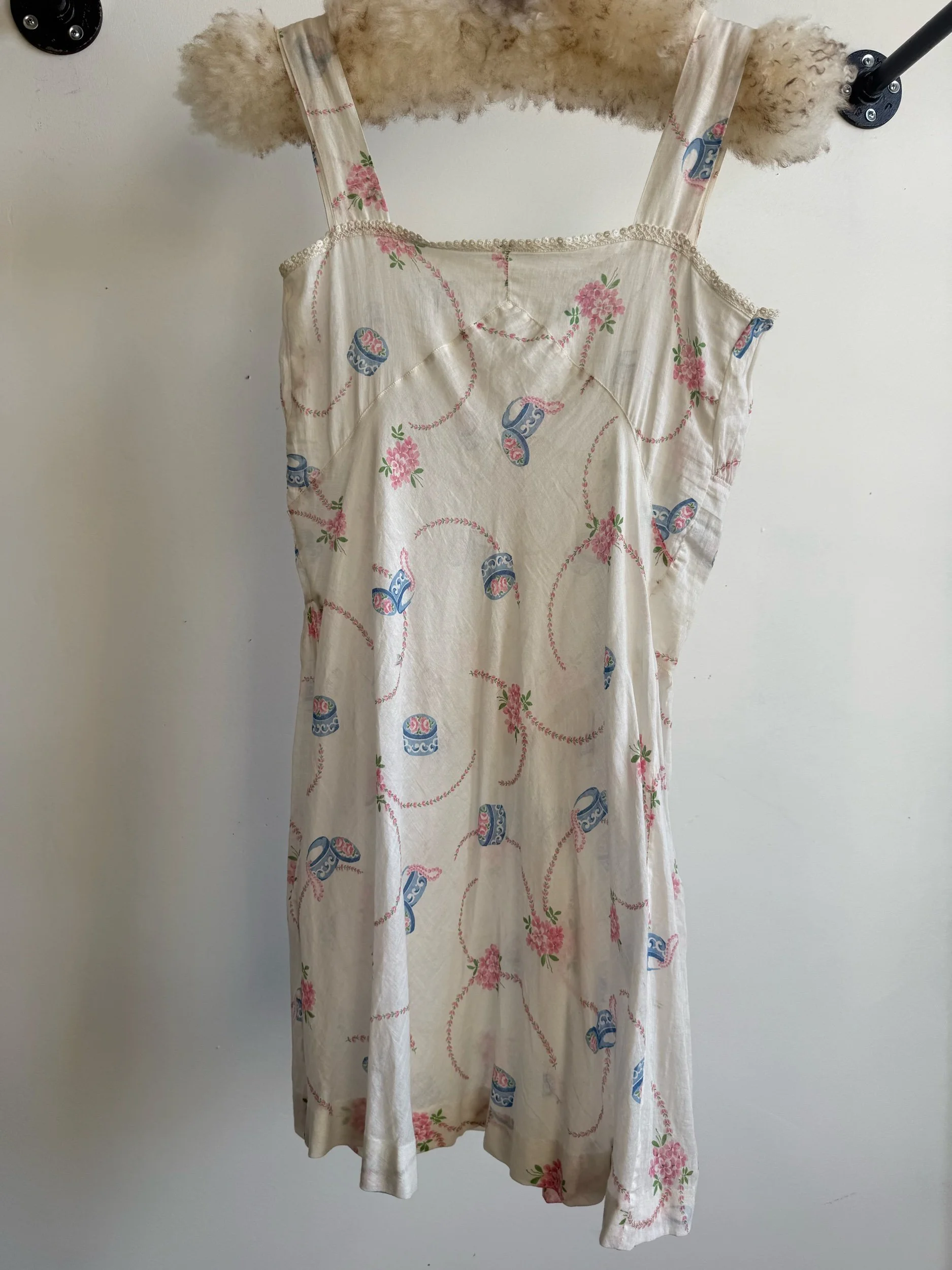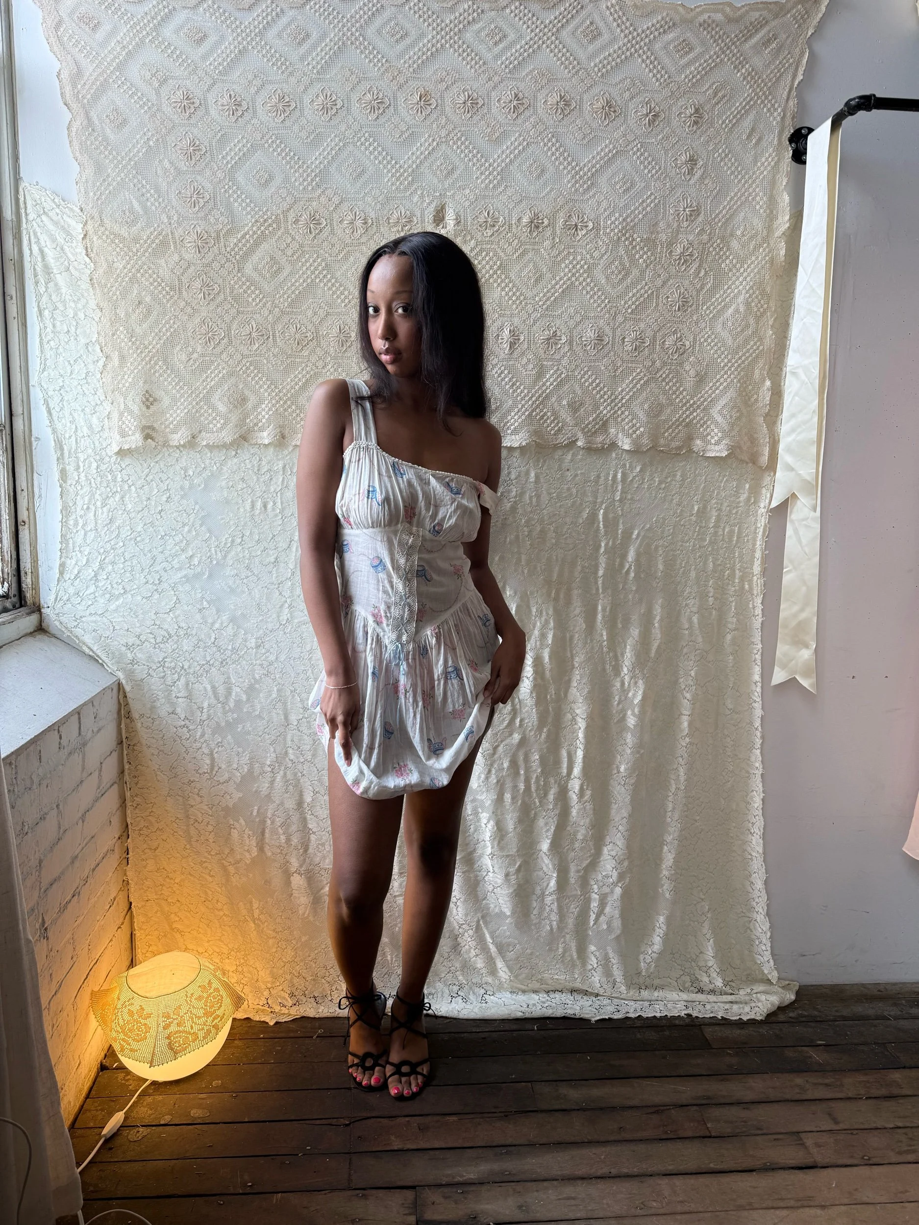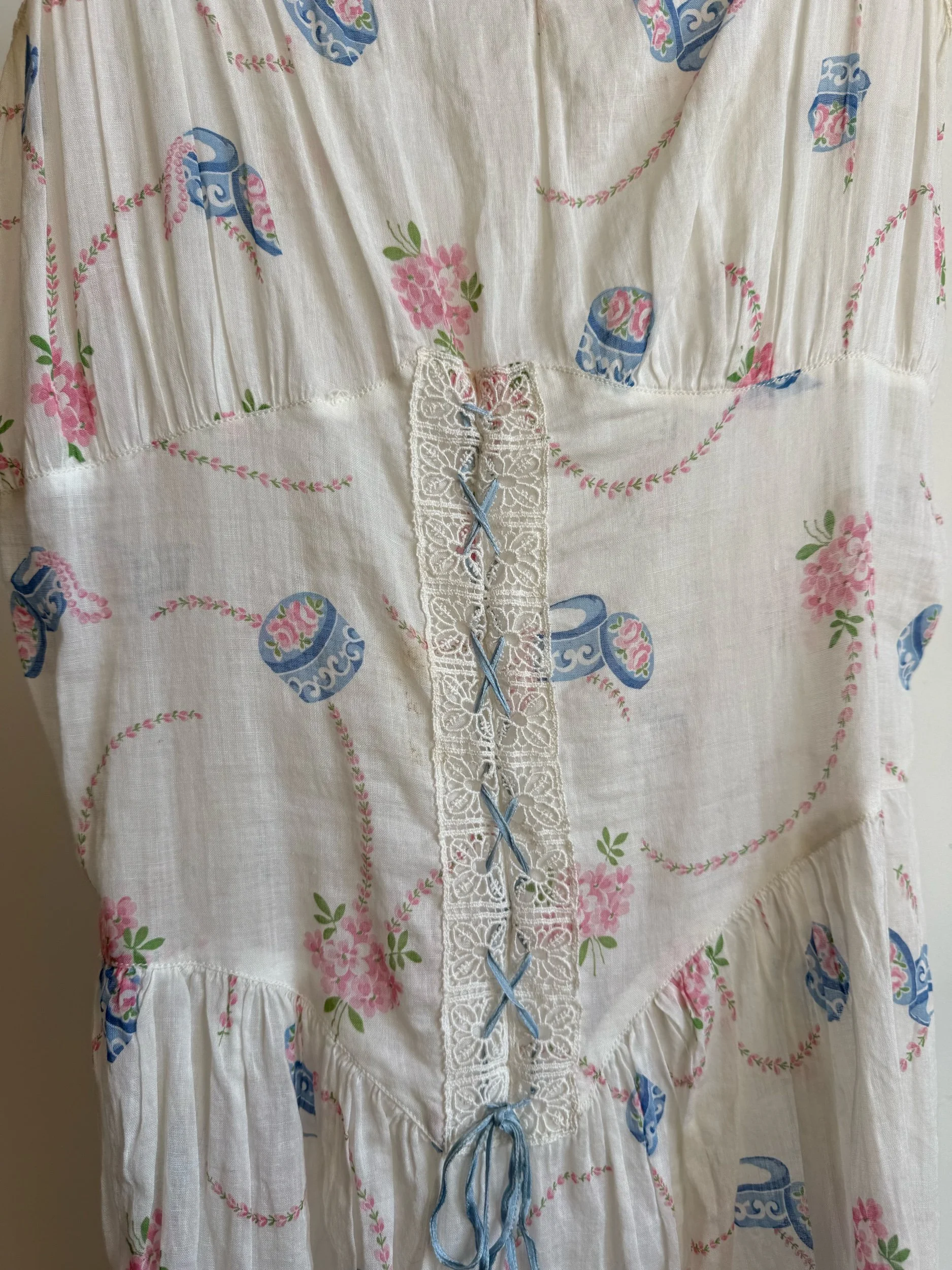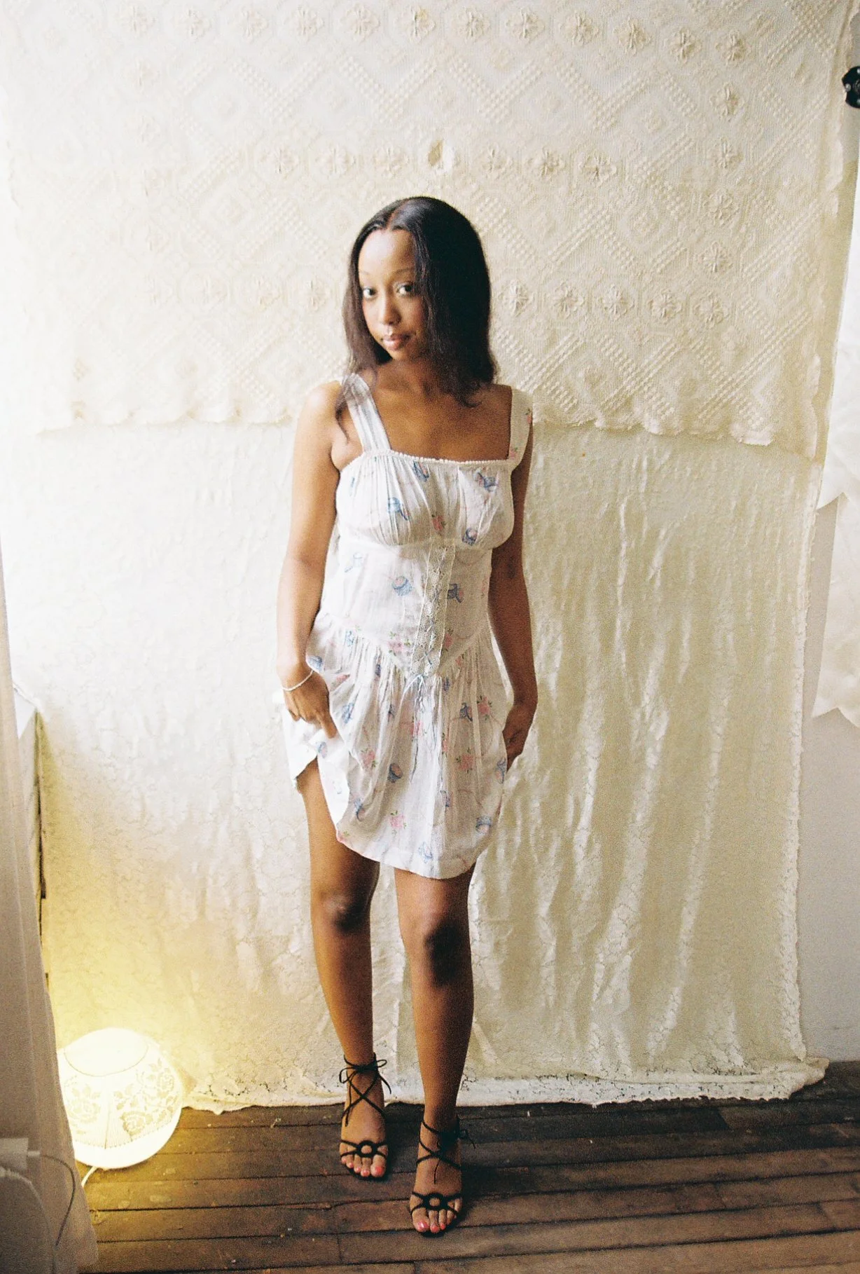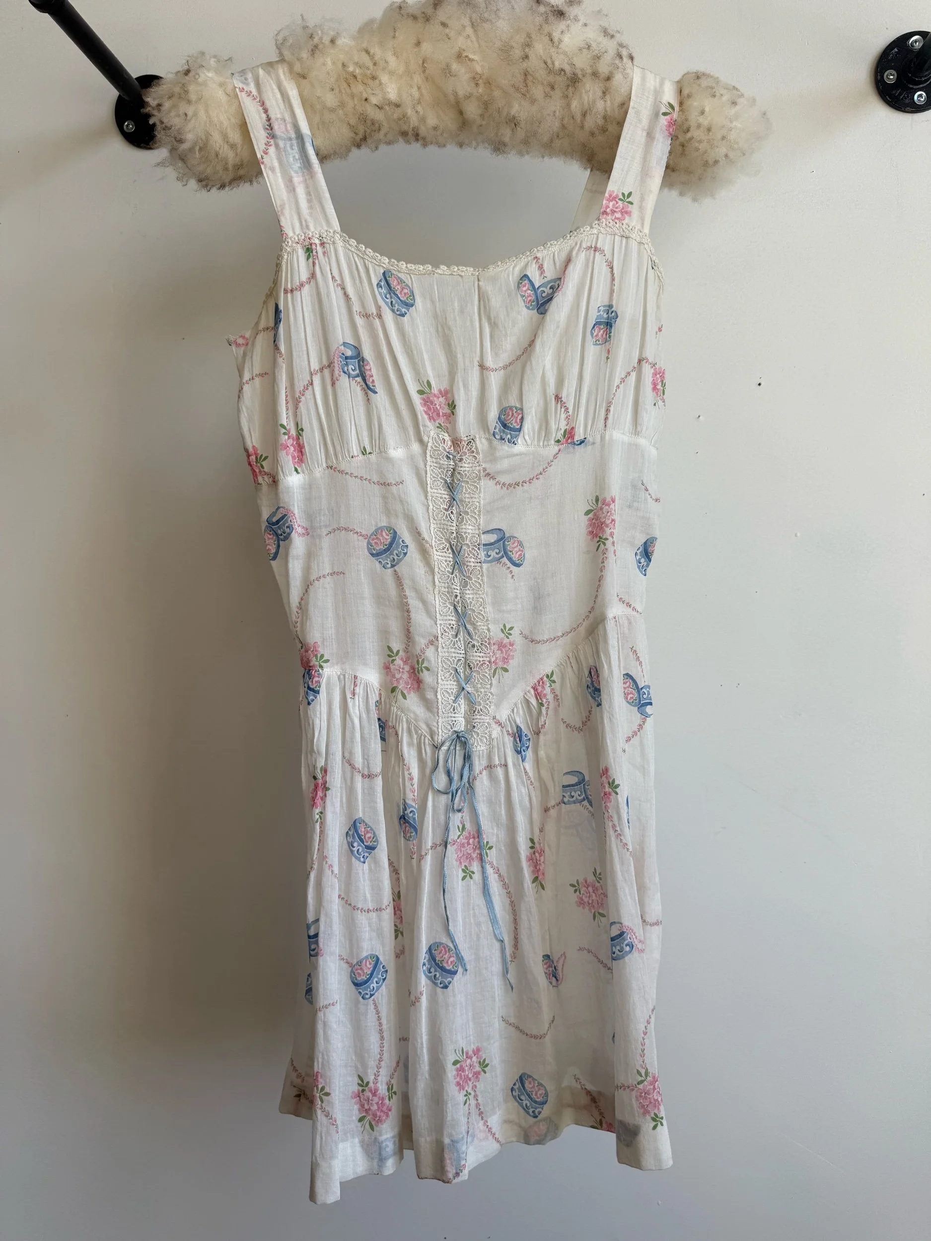 Antique printed dress remade in the 80’s or 90’s, milkmaid/ prairie style mini with lace up front, semi-sheer cotton. Small discoloration/ stain on the front. Best fits small