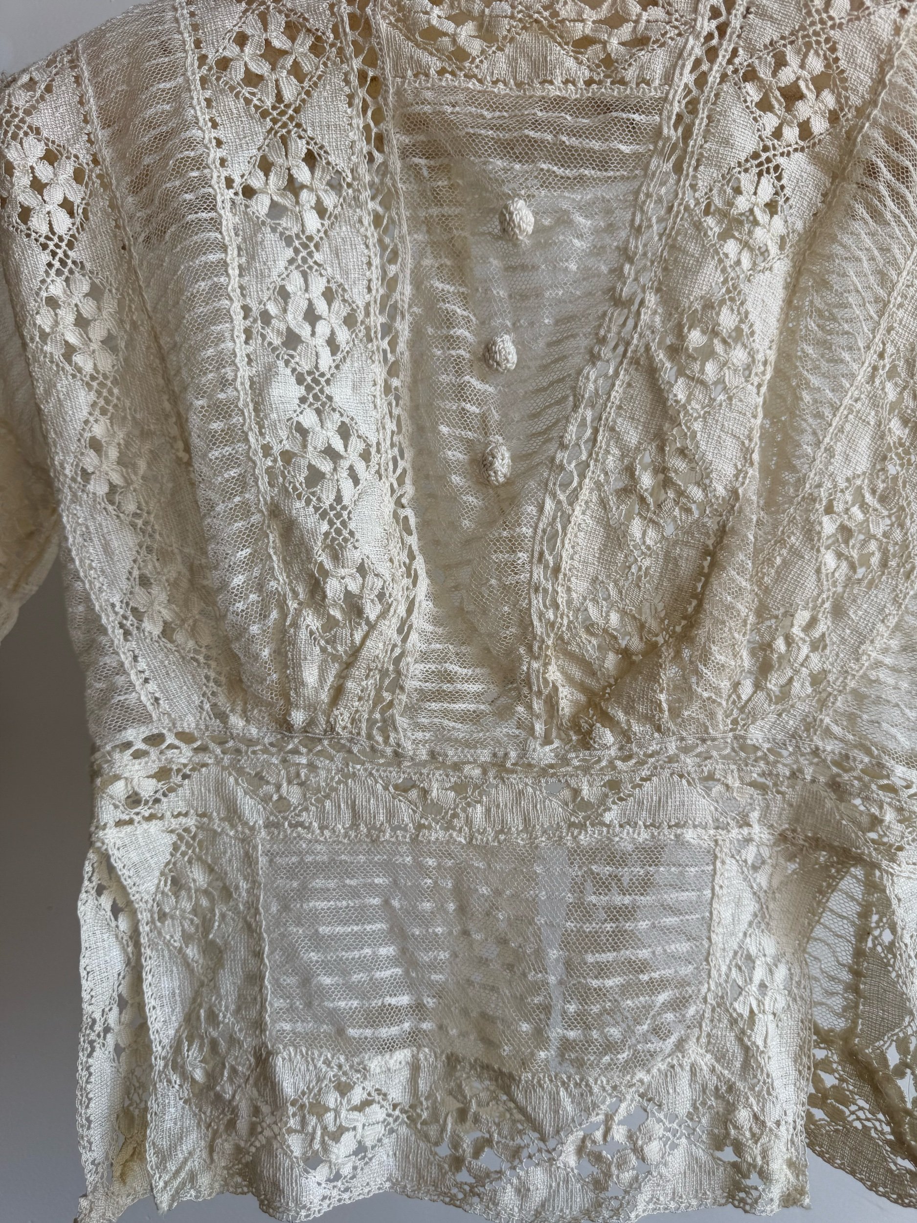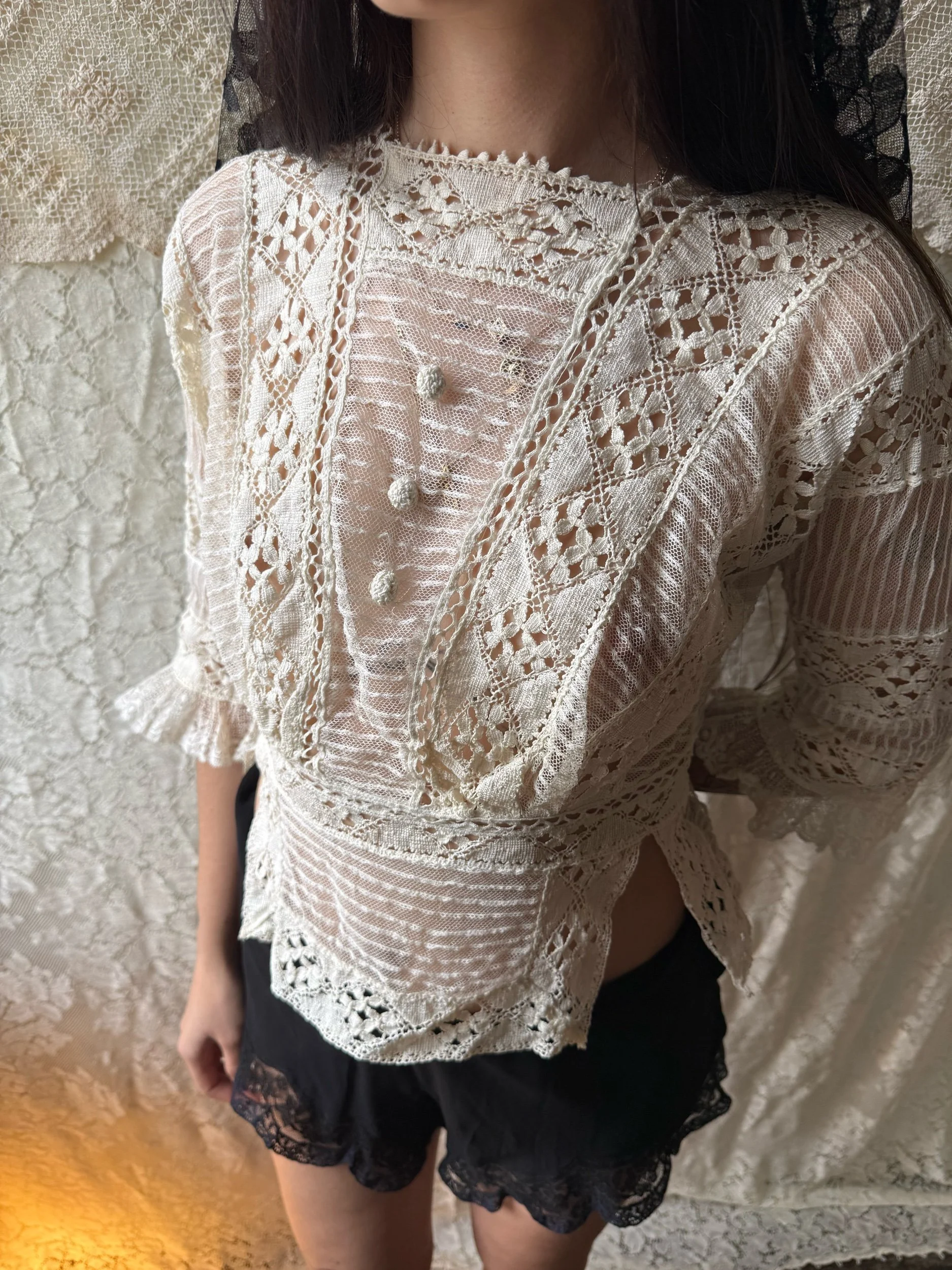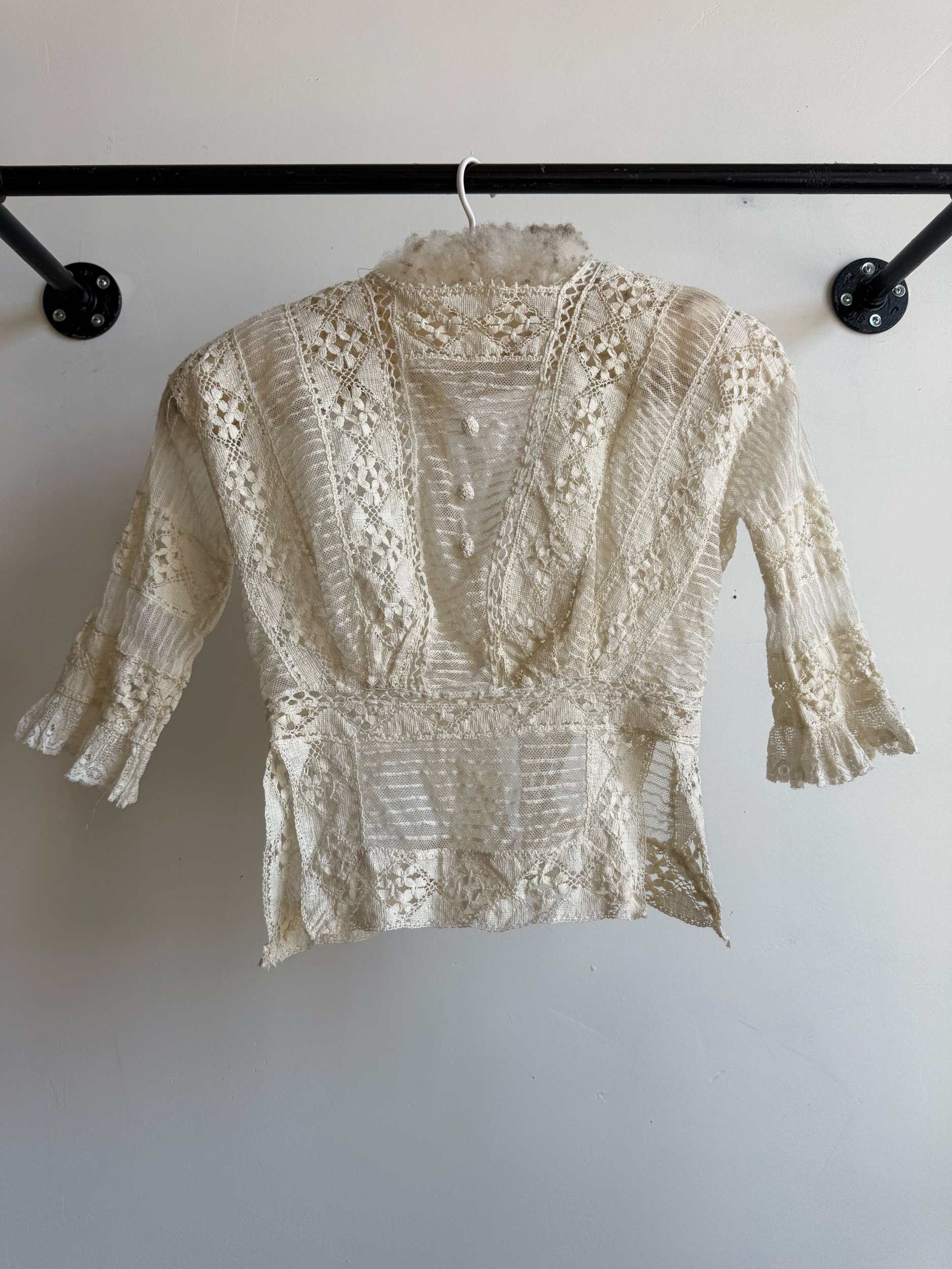 Antique lace blouse, buttons up the back. Love the pom-pom detail on the front, ¾ length sleeves and panels at the hem. Best fits xs/s