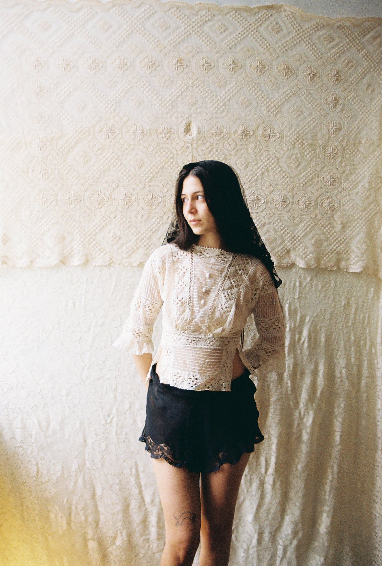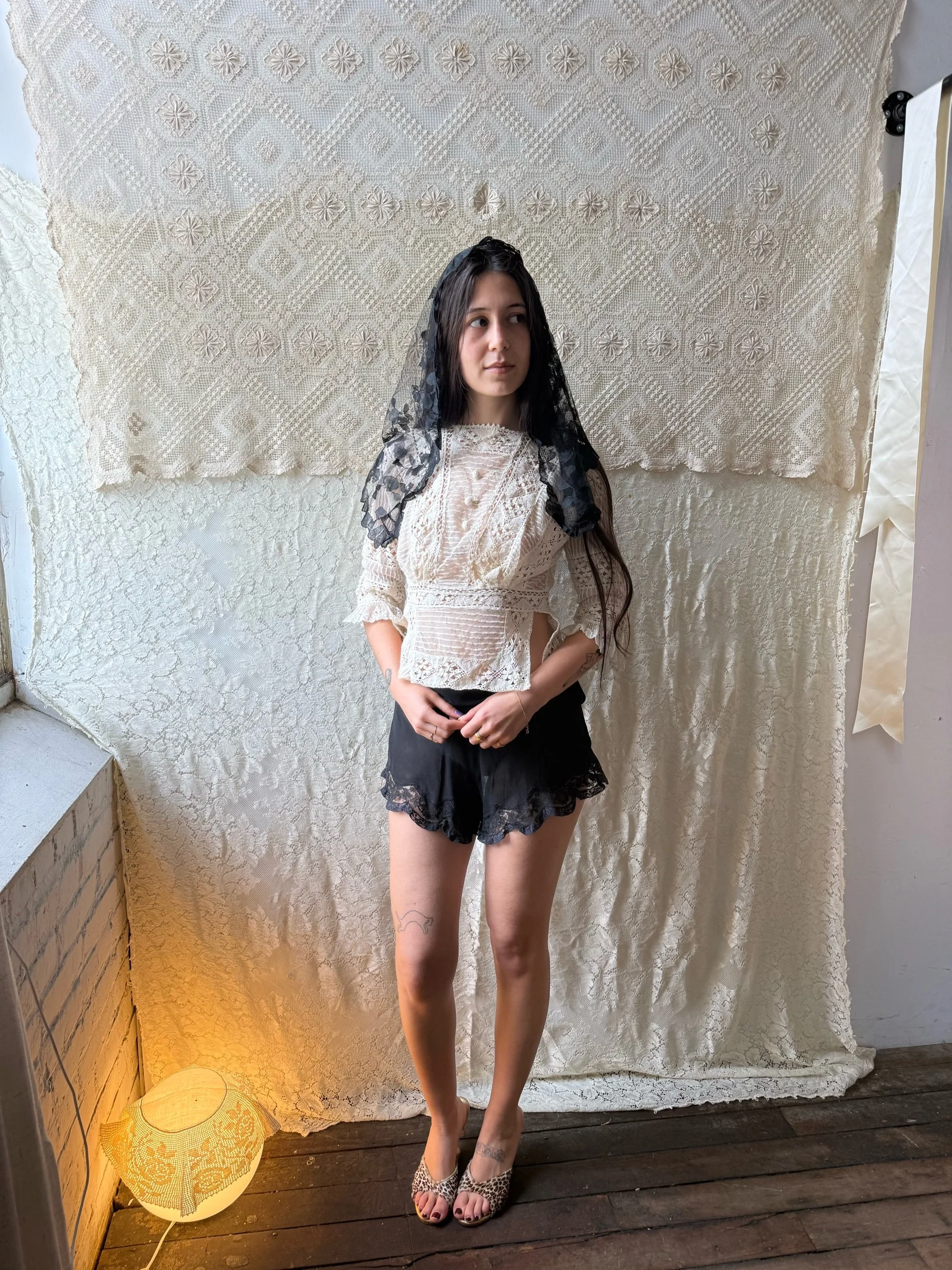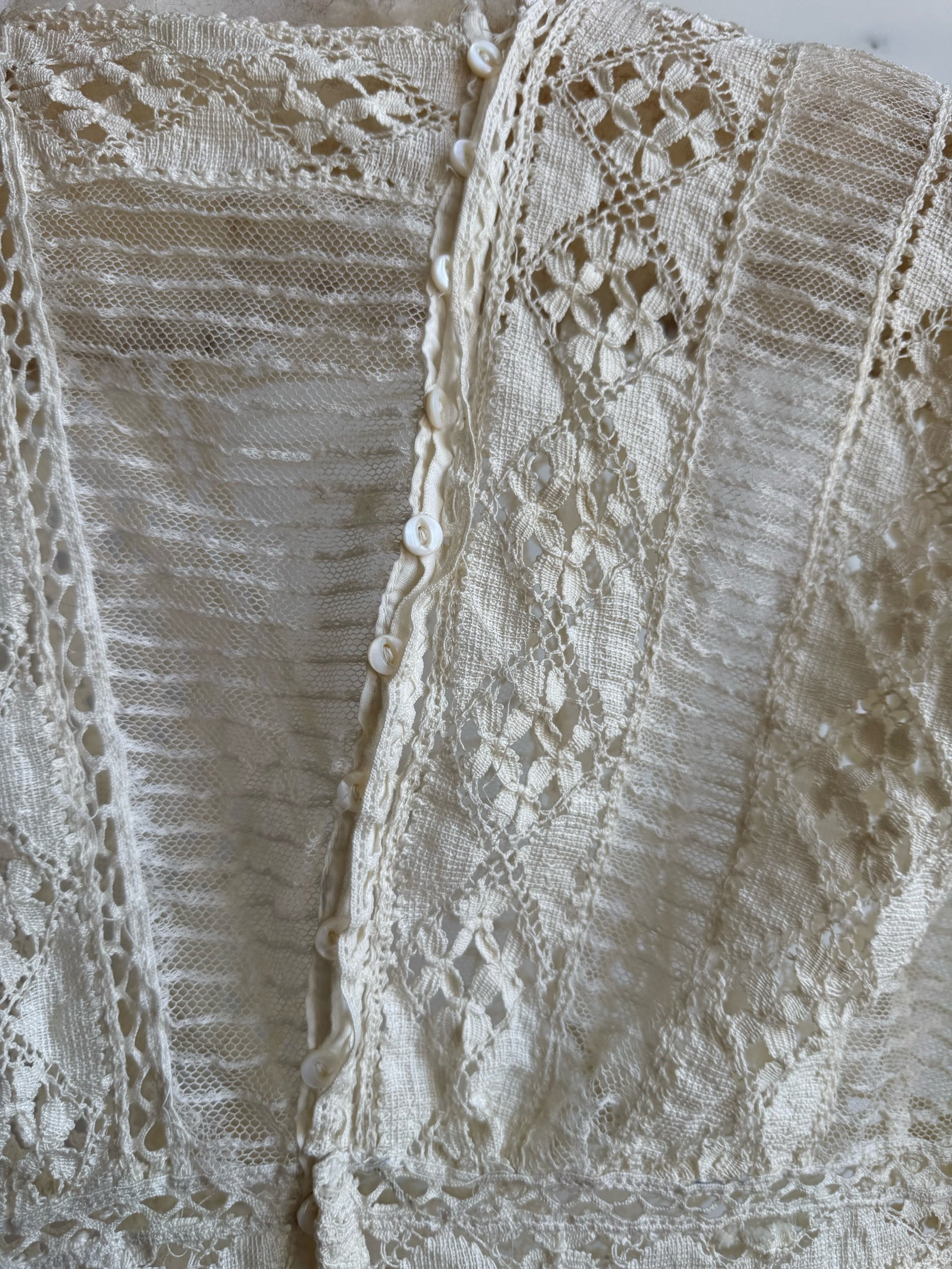 Antique lace blouse, buttons up the back. Love the pom-pom detail on the front, ¾ length sleeves and panels at the hem. Best fits xs/s