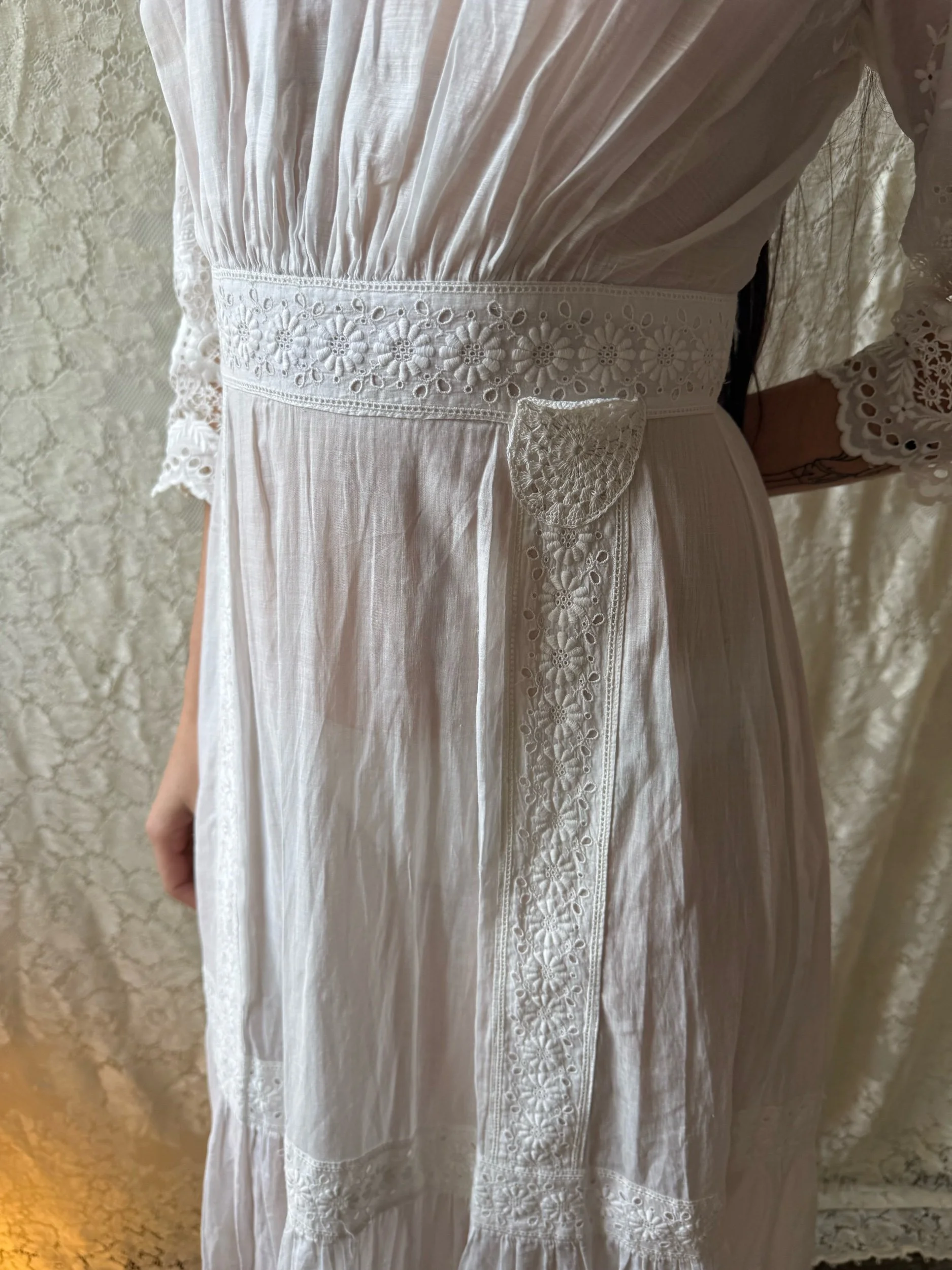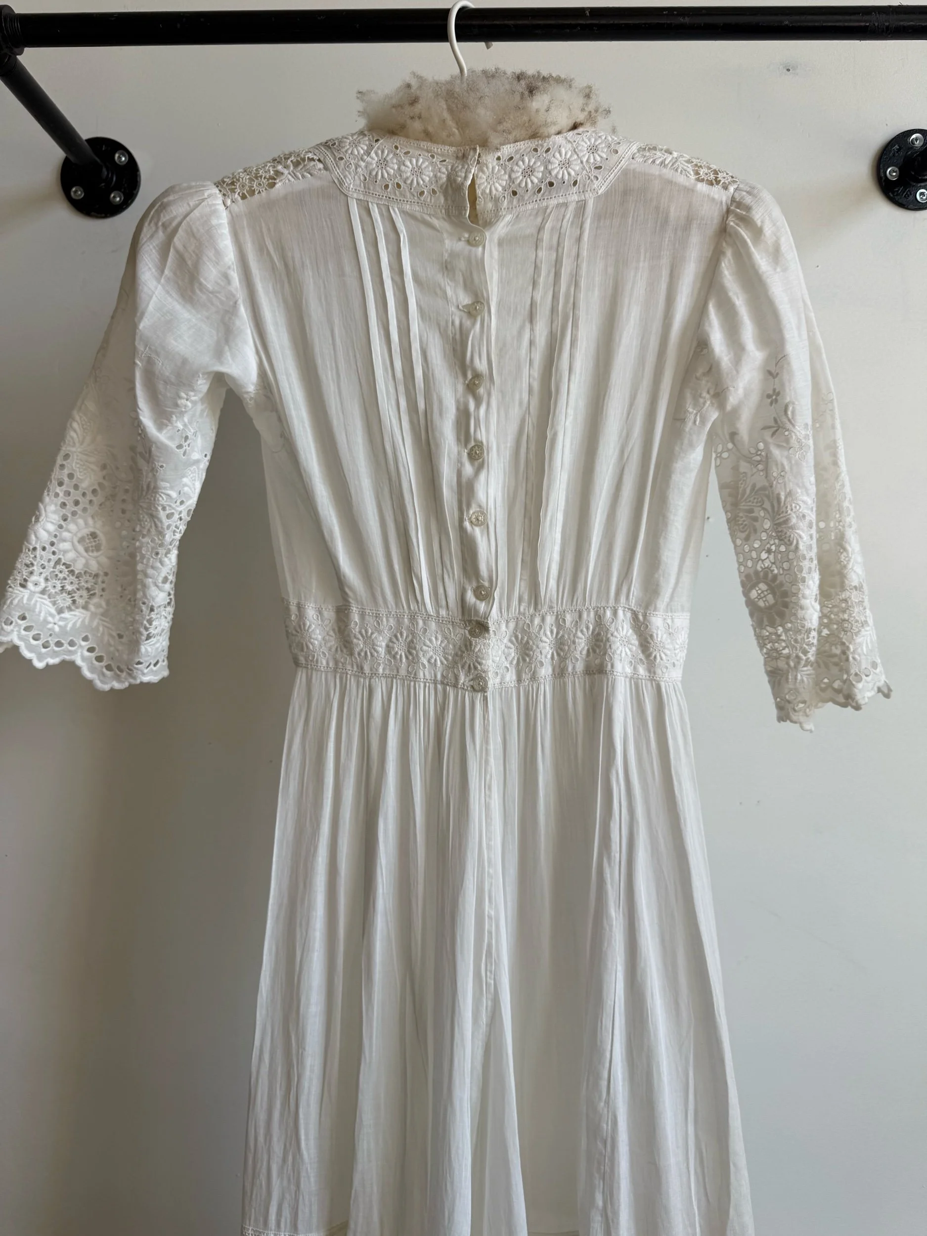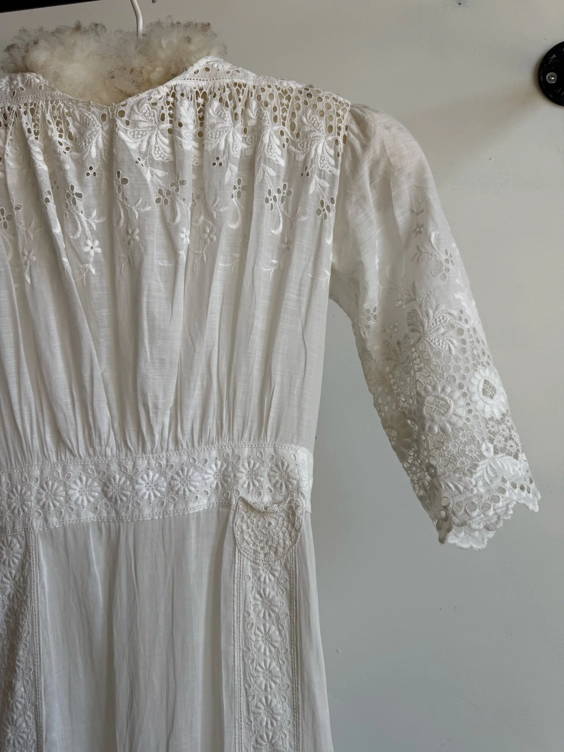Cotton Edwardian lawn dress with the most darling tiny crochet pocket. One small tear at the back hem, otherwise perfect condition. Best fits xs/s