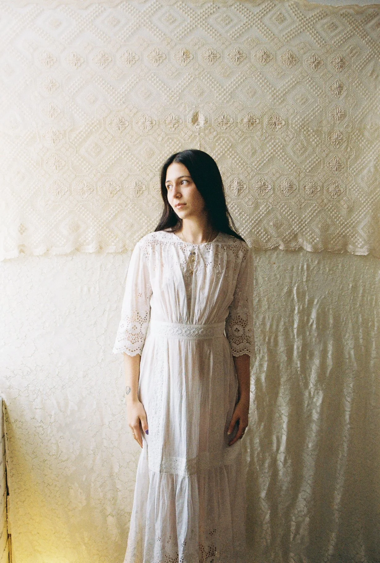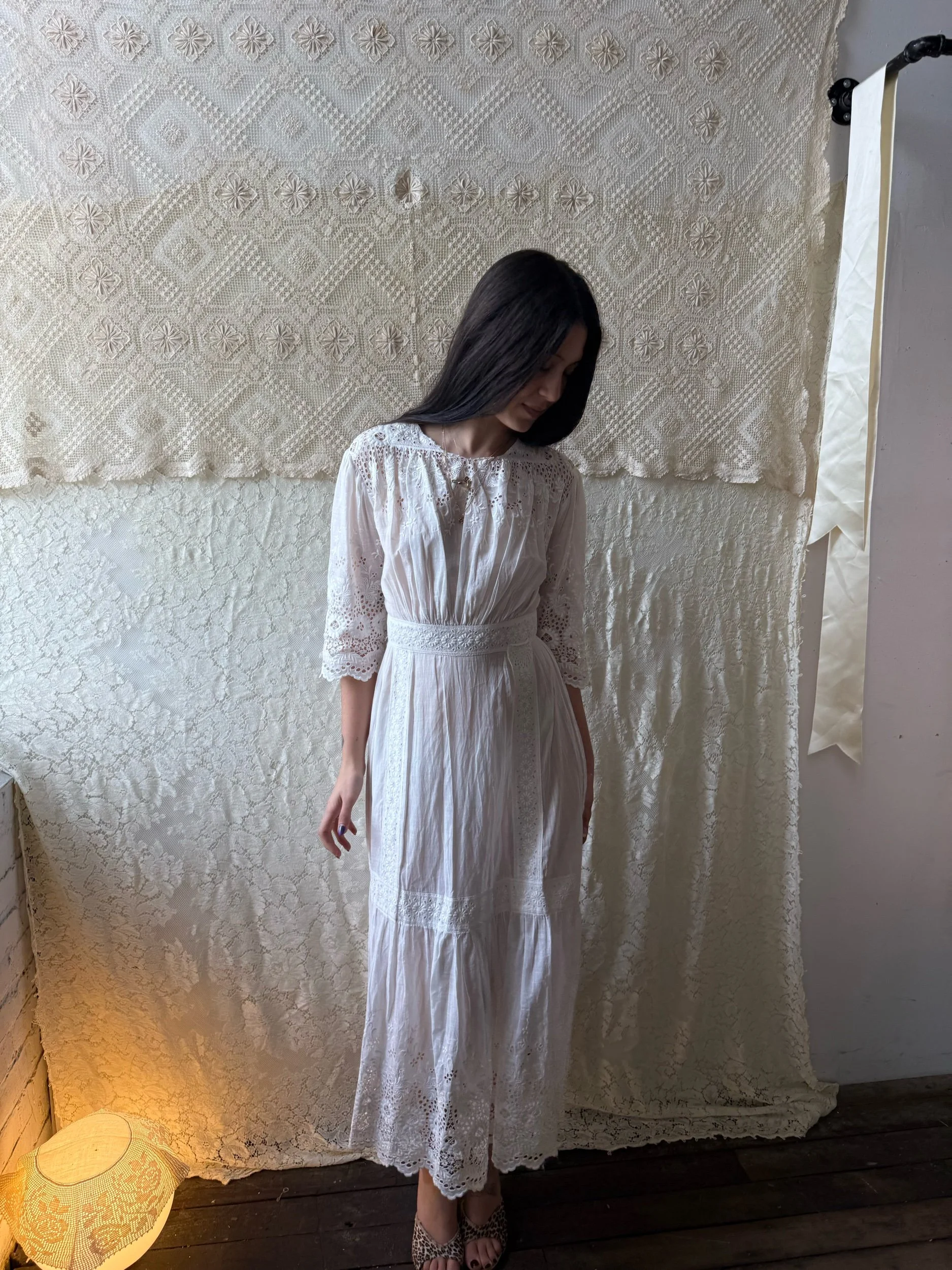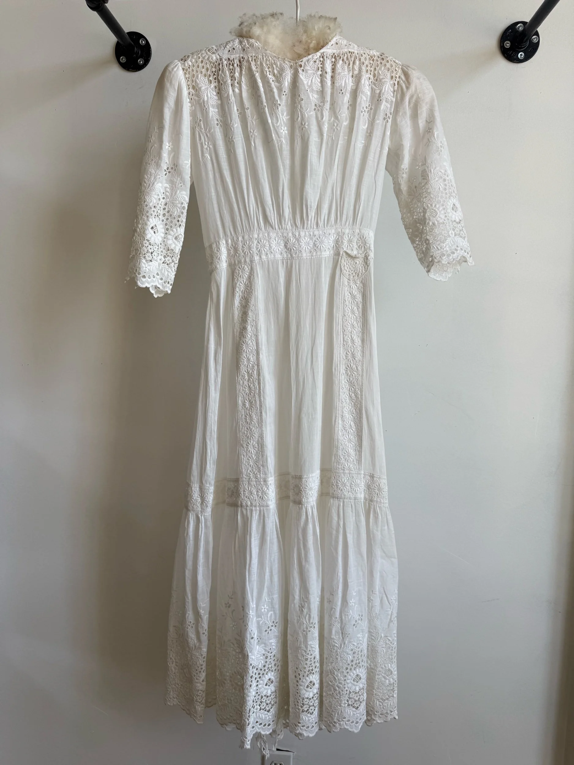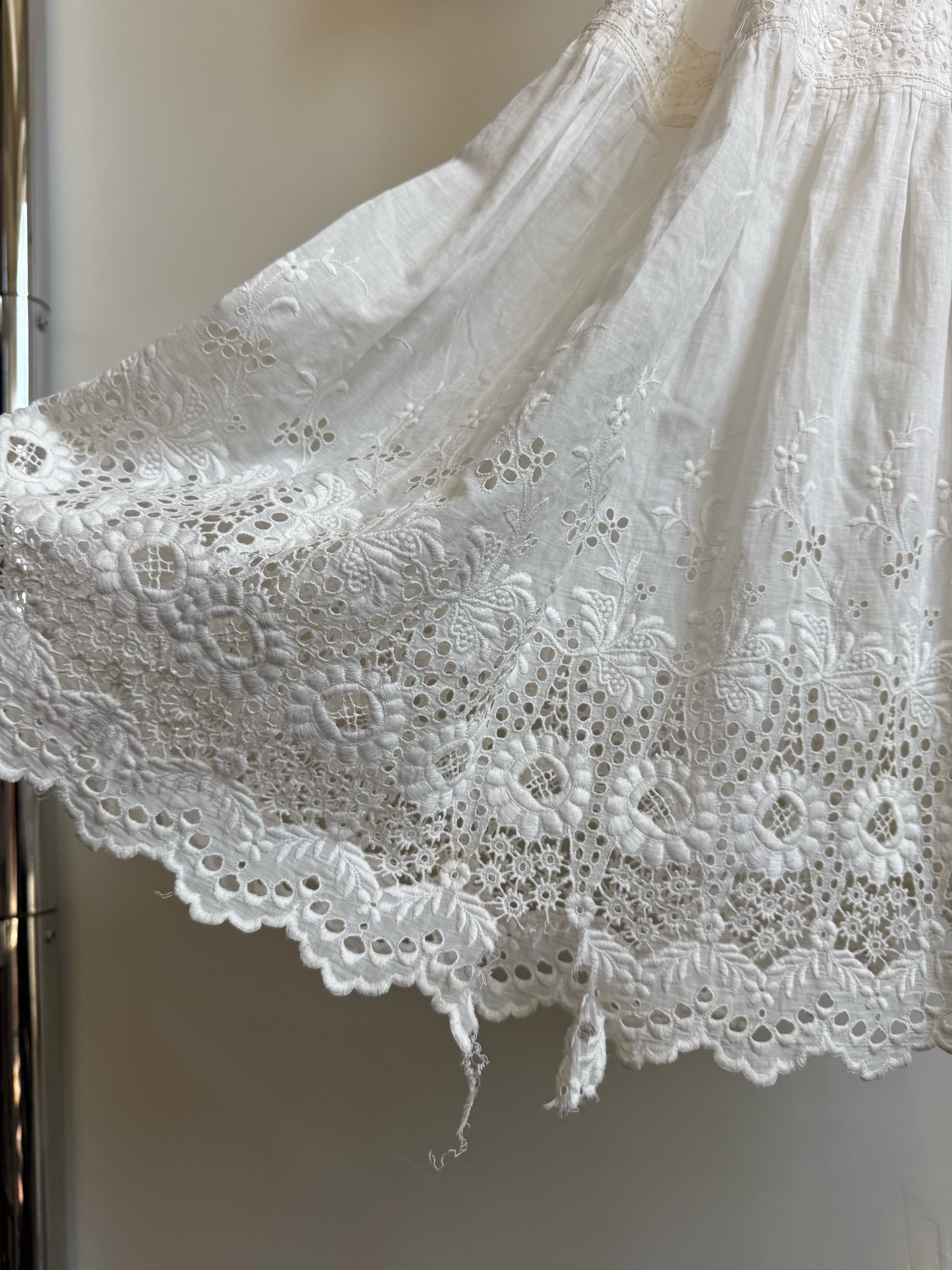 Cotton Edwardian lawn dress with the most darling tiny crochet pocket. One small tear at the back hem, otherwise perfect condition. Best fits xs/s
