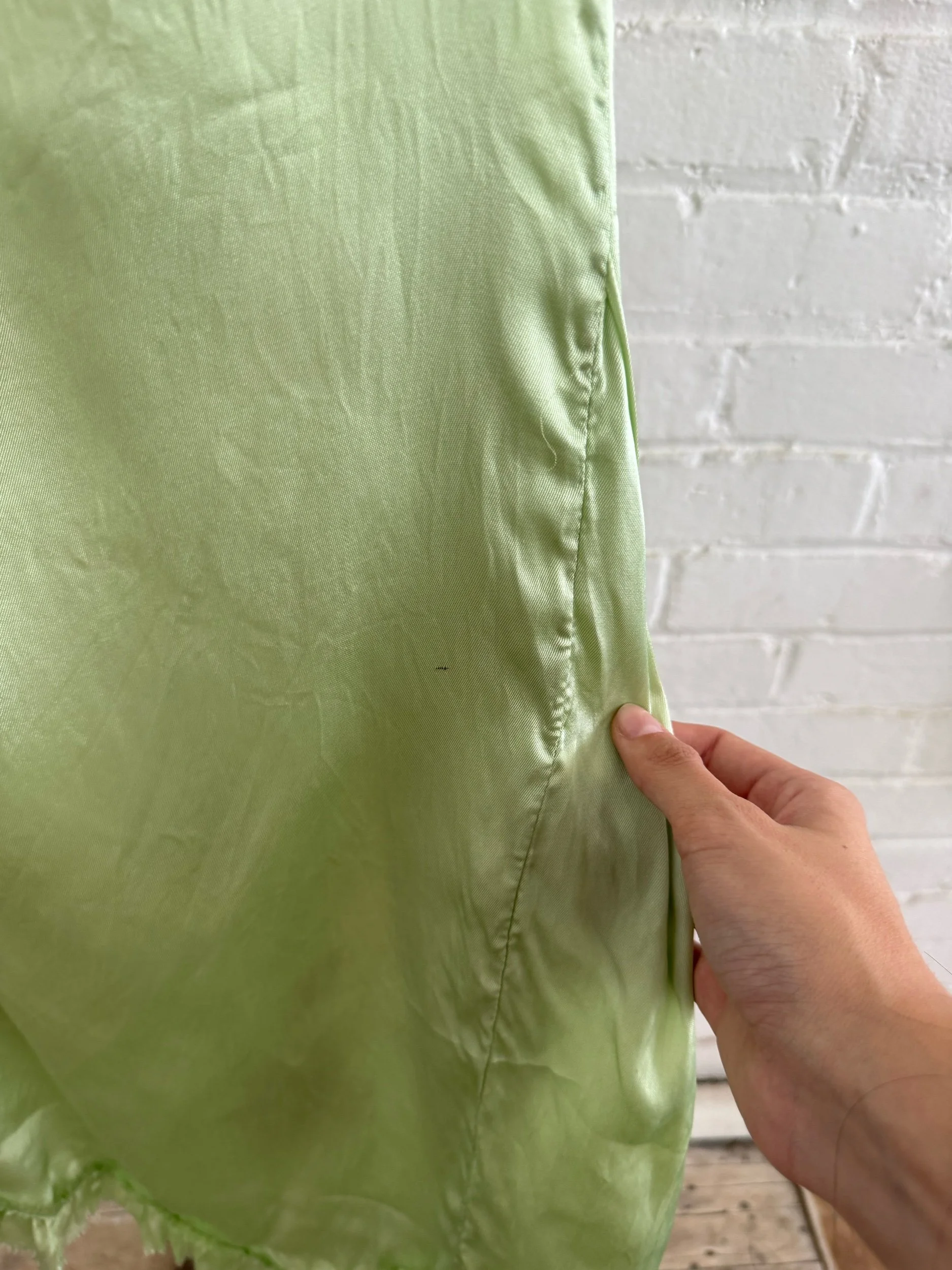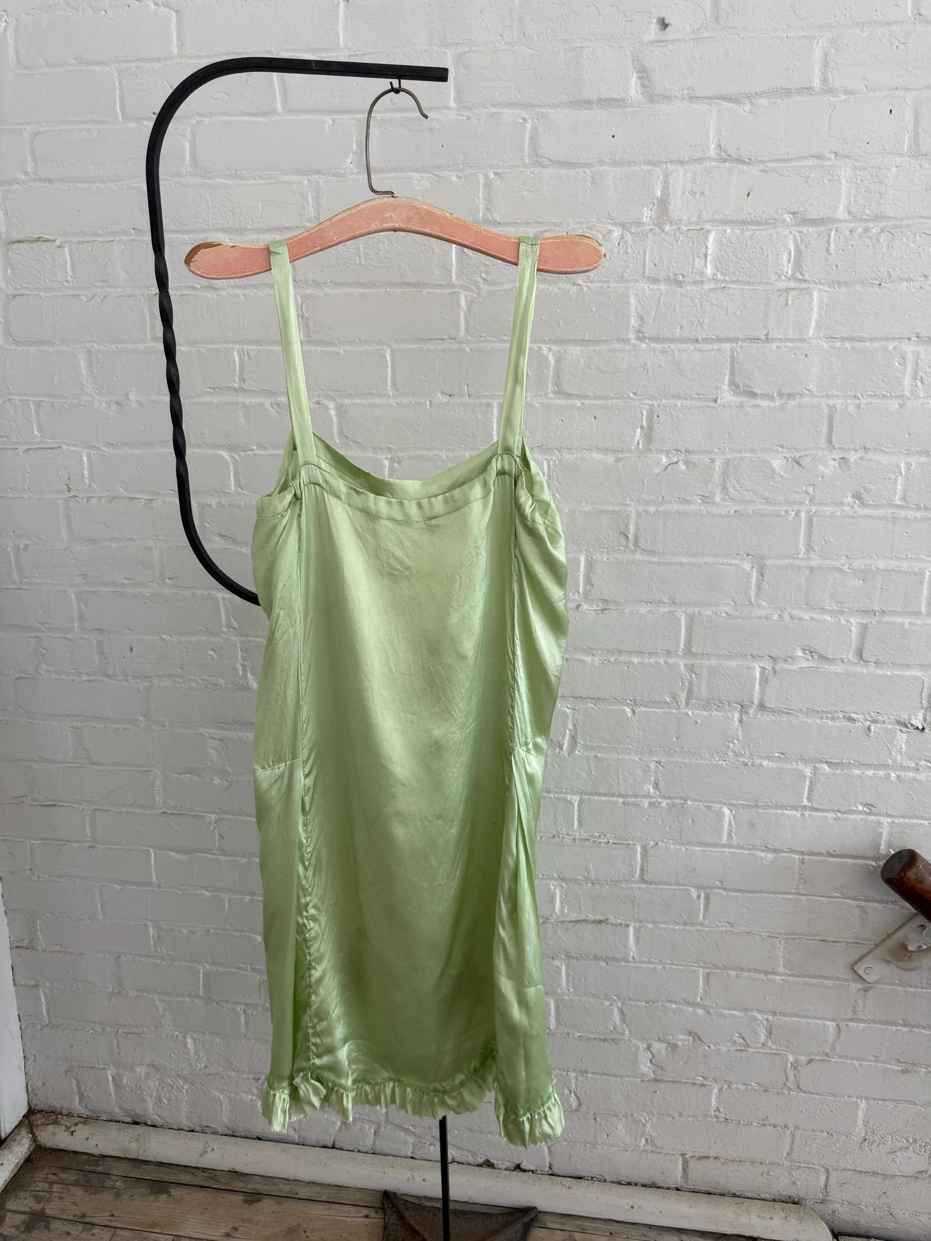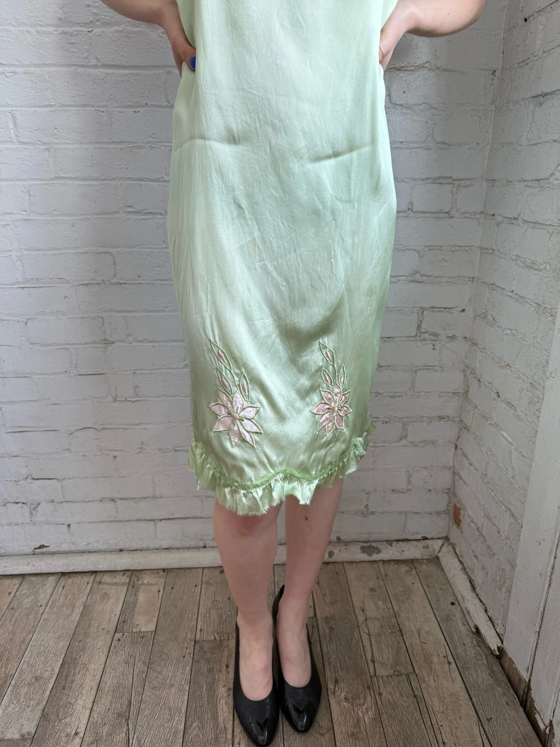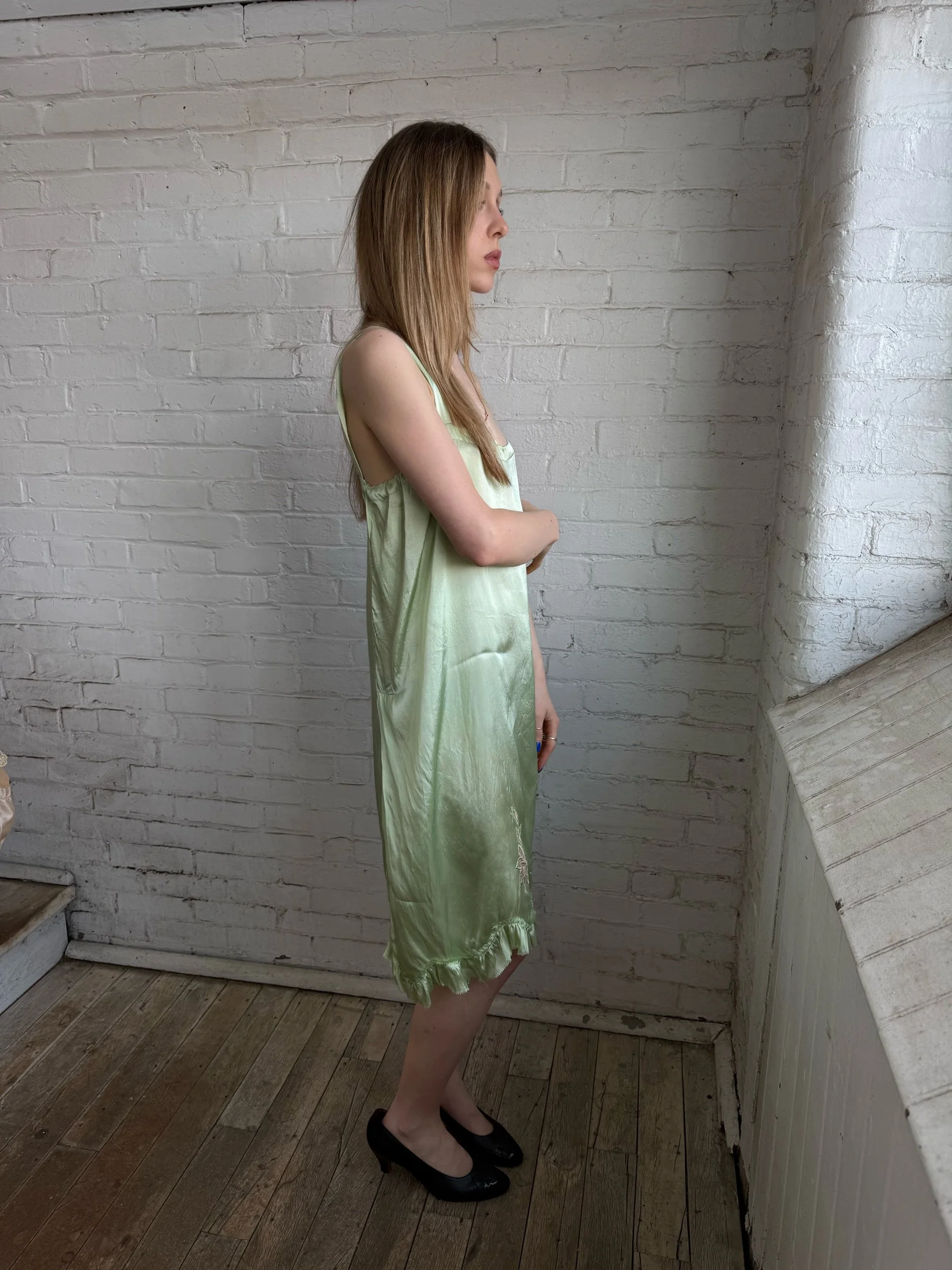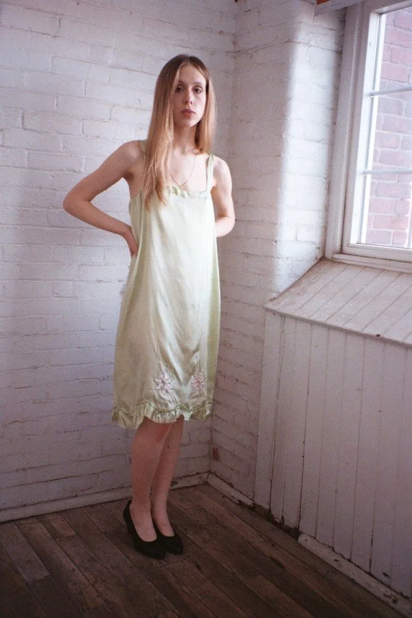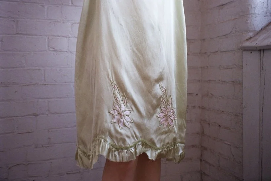 Shop › 1920s Slip Image 1 of 7 Image 2 of 7 Image 3 of 7 Image 4 of 7 Image 5 of 7 Image 6 of 7 Image 7 of 7 1920s Slip $85.00 Simple green slip with floral details. One tiny mark shown in last slide.Pit-pit: 20”Waist: 20”Length: 40” Add To Cart Added! Simple green slip with floral details. One tiny mark shown in last slide.Pit-pit: 20”Waist: 20”Length: 40”