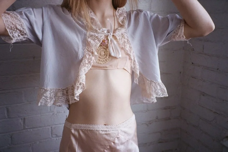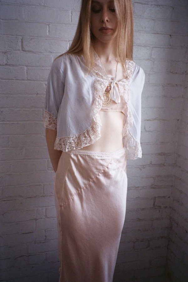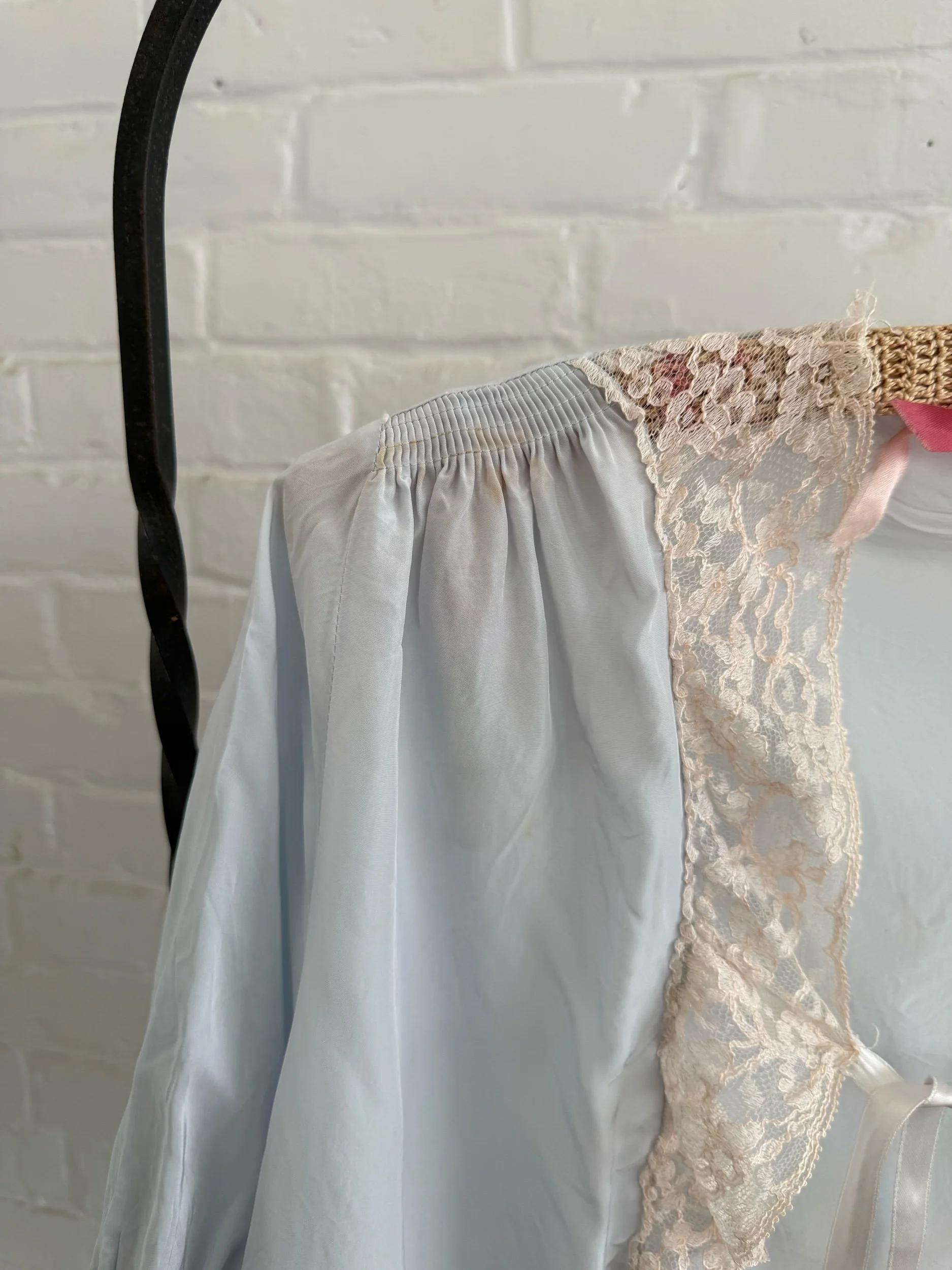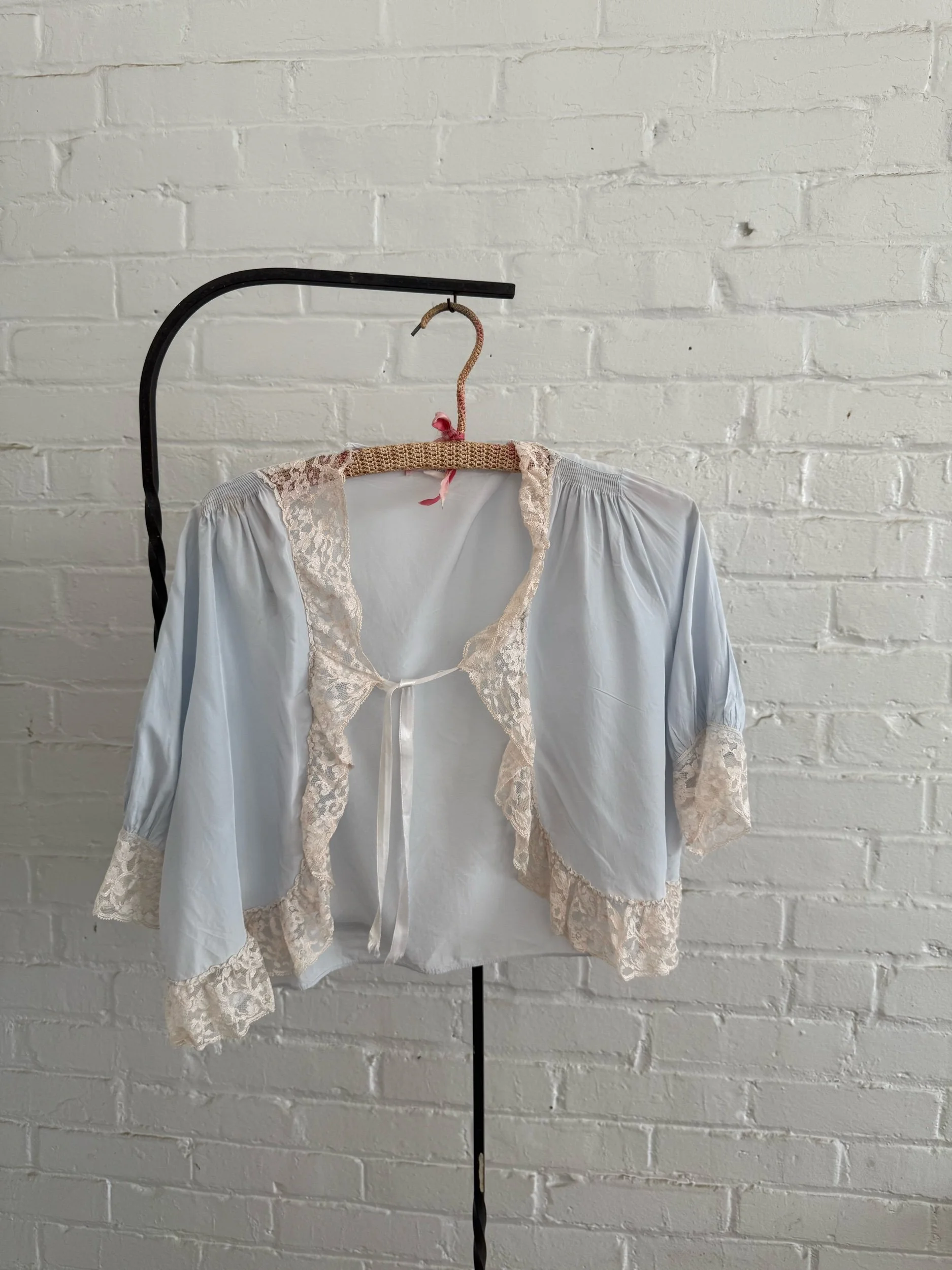 Shop › 1950s Bed Jacket Image 1 of 5 Image 2 of 5 Image 3 of 5 Image 4 of 5 Image 5 of 5 1950s Bed Jacket $48.00 Baby blue rayon bed jacket. Small mark on the shoulder shown in second to last slide. Pit-pit: 22”Length: 17” Add To Cart Added! Baby blue rayon bed jacket. Small mark on the shoulder shown in second to last slide. Pit-pit: 22”Length: 17”